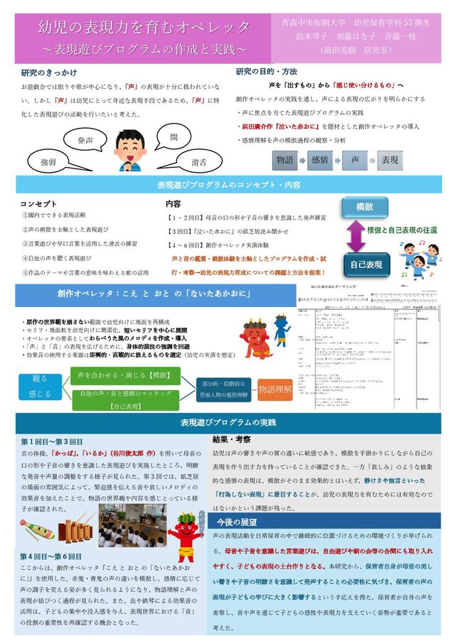 幼児の声による表現に着目し、オペレッタ『泣いた赤おに』を創作。創作オペレッタを導入した『声と言葉の表現遊びプログラム』(全6回)を実践・考察し、声を基盤とした表現力の育成について、その有用性、課題、新たな視点を提案する。