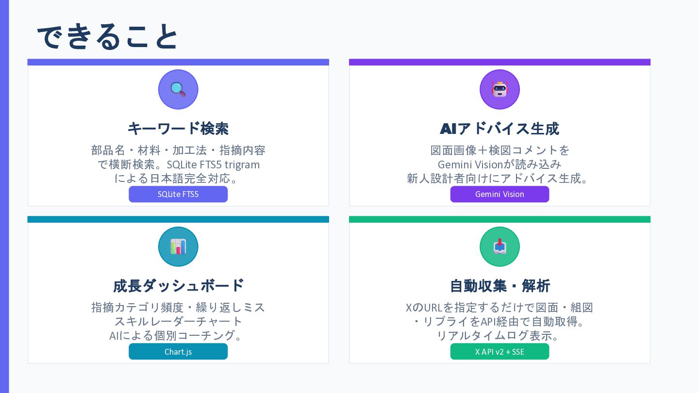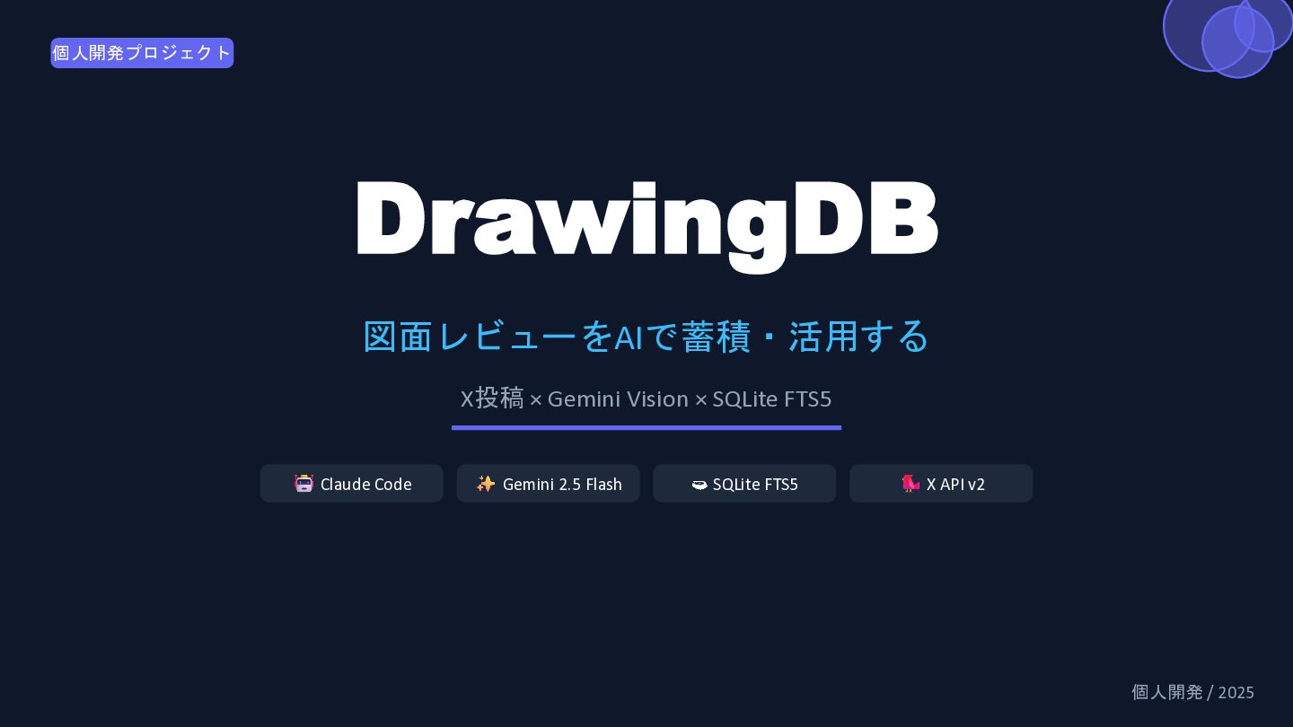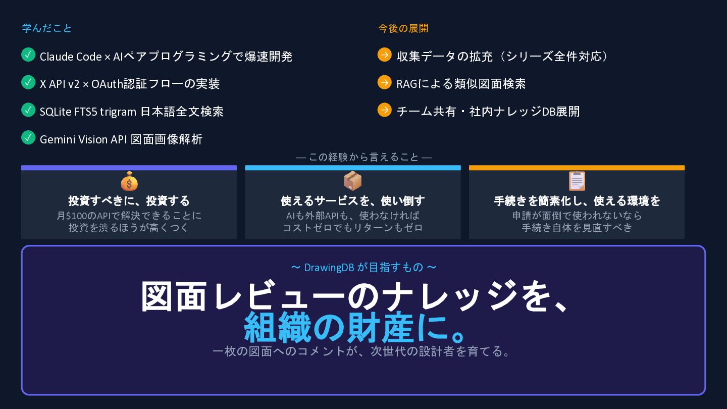 × OAuth認証フローの実装 ✓ SQLite FTS5 trigram 日本語全文検索 ✓ Gemini Vision API 図面画像解析 今後の展開 → 収集データの拡充(シリーズ全件対応) → RAGによる類似図面検索 → チーム共有・社内ナレッジDB展開 ── この経験から言えること ── 投資すべきに、投資する 月$100のAPIで解決できることに 投資を渋るほうが高くつく 使えるサービスを、使い倒す AIも外部APIも、使わなければ コストゼロでもリターンもゼロ 手続きを簡素化し、使える環境を 申請が面倒で使われないなら 手続き自体を見直すべき 〜 DrawingDB が目指すもの 〜 図面レビューのナレッジを、 組織の財産に。 一枚の図面へのコメントが、次世代の設計者を育てる。
