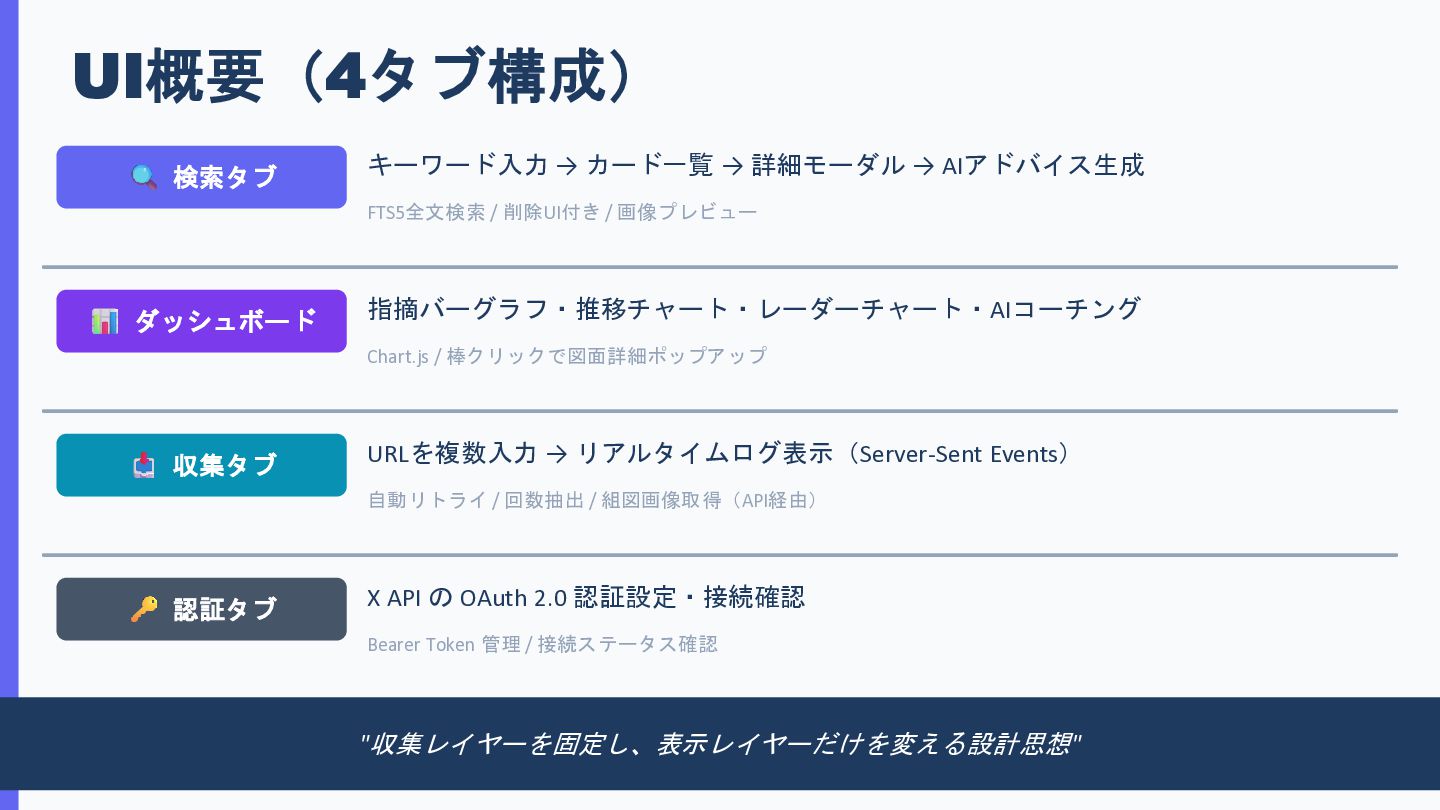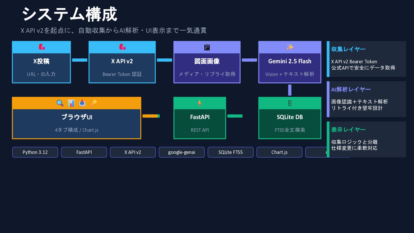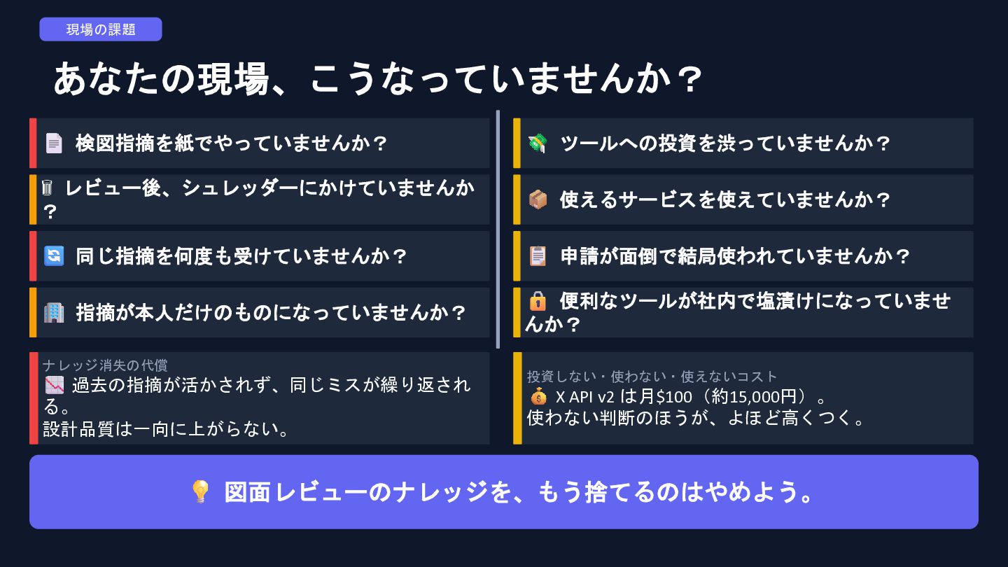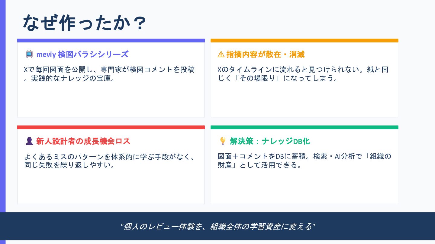 × OAuth認証フローの実装 ✓ SQLite FTS5 trigram 日本語全文検索 ✓ Gemini Vision API 図面画像解析 今後の展開 → 収集データの拡充(シリーズ全件対応) → RAGによる類似図面検索 → チーム共有・社内ナレッジDB展開 ── この経験から言えること ── 投資すべきに、投資する 月$100のAPIで解決できることに 投資を渋るほうが高くつく 使えるサービスを、使い倒す AIも外部APIも、使わなければ コストゼロでもリターンもゼロ 手続きを簡素化し、使える環境を 申請が面倒で使われないなら 手続き自体を見直すべき 〜 DrawingDB が目指すもの 〜 図面レビューのナレッジを、 組織の財産に。 一枚の図面へのコメントが、次世代の設計者を育てる。