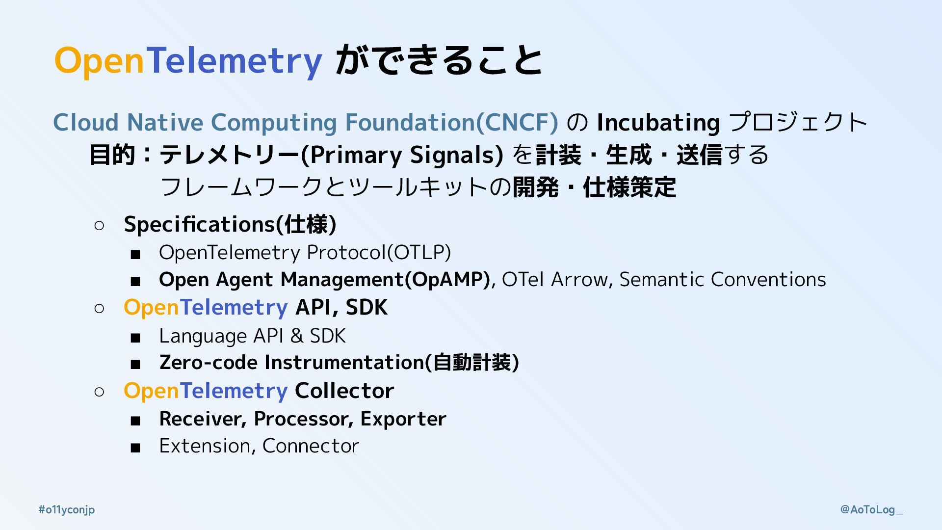 @AoToLog_ #o11yconjp OpenTelemetry から学ぶ