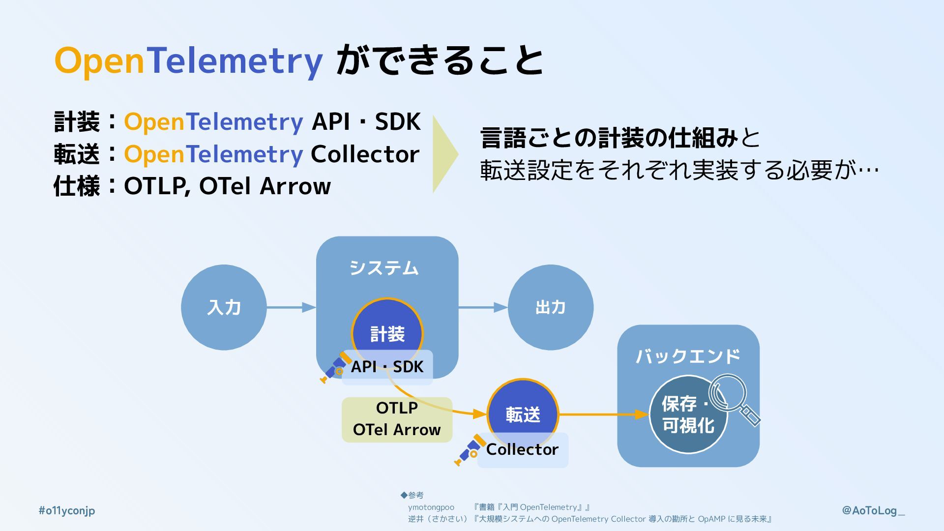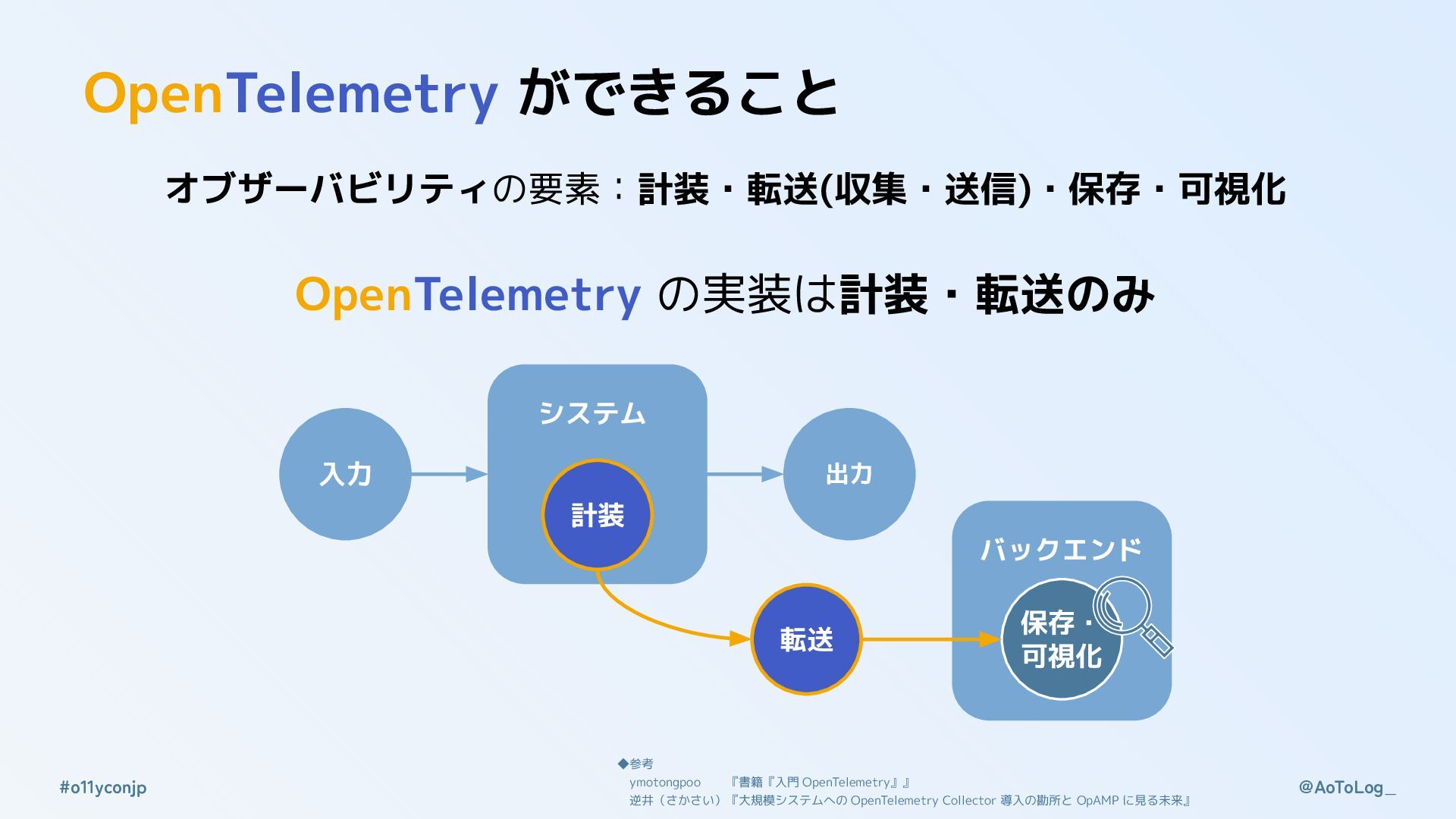 @AoToLog_ #o11yconjp OpenTelemetry ができること オブザーバビリティの要素:計装・転送(収集・送信)・保存・可視化 OpenTelemetry の実装は計装・転送のみ 入力 出力 システム