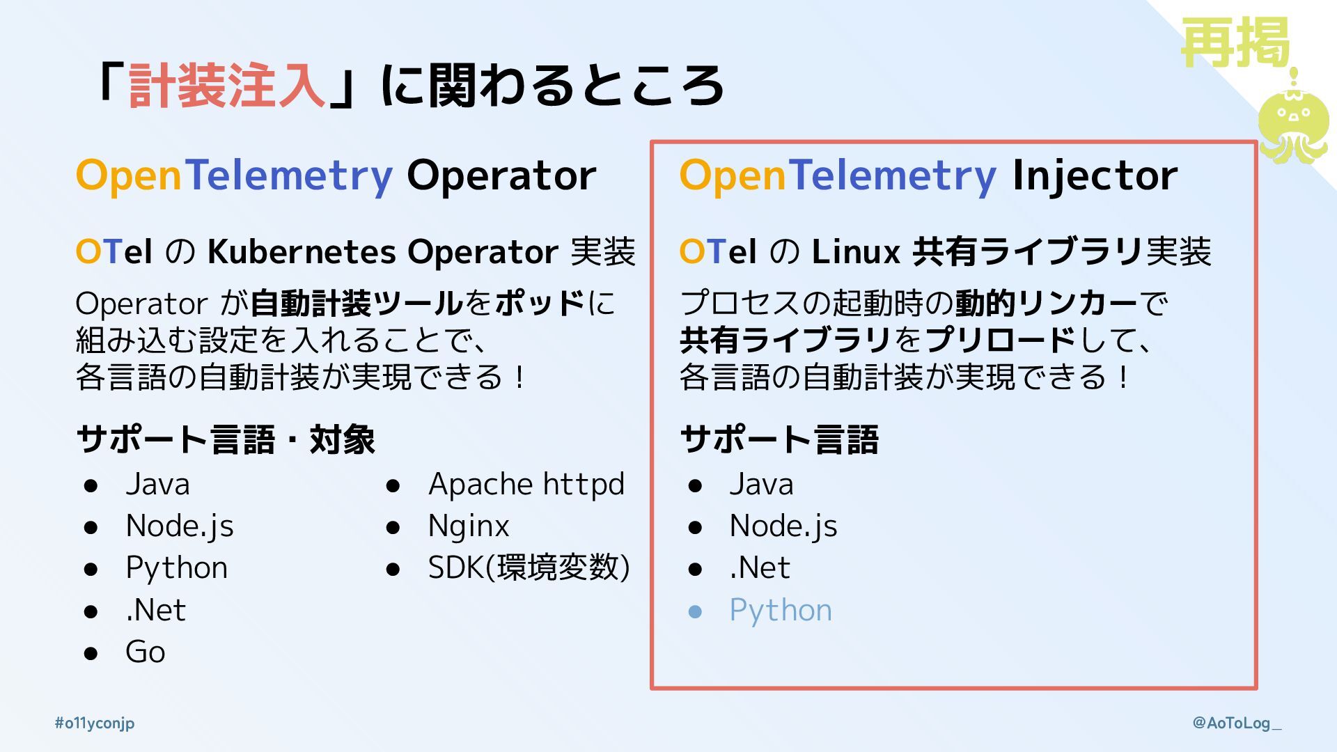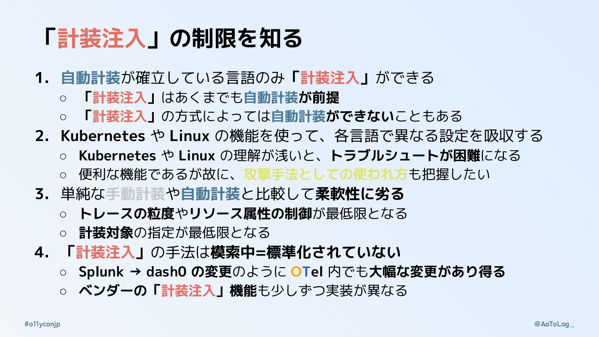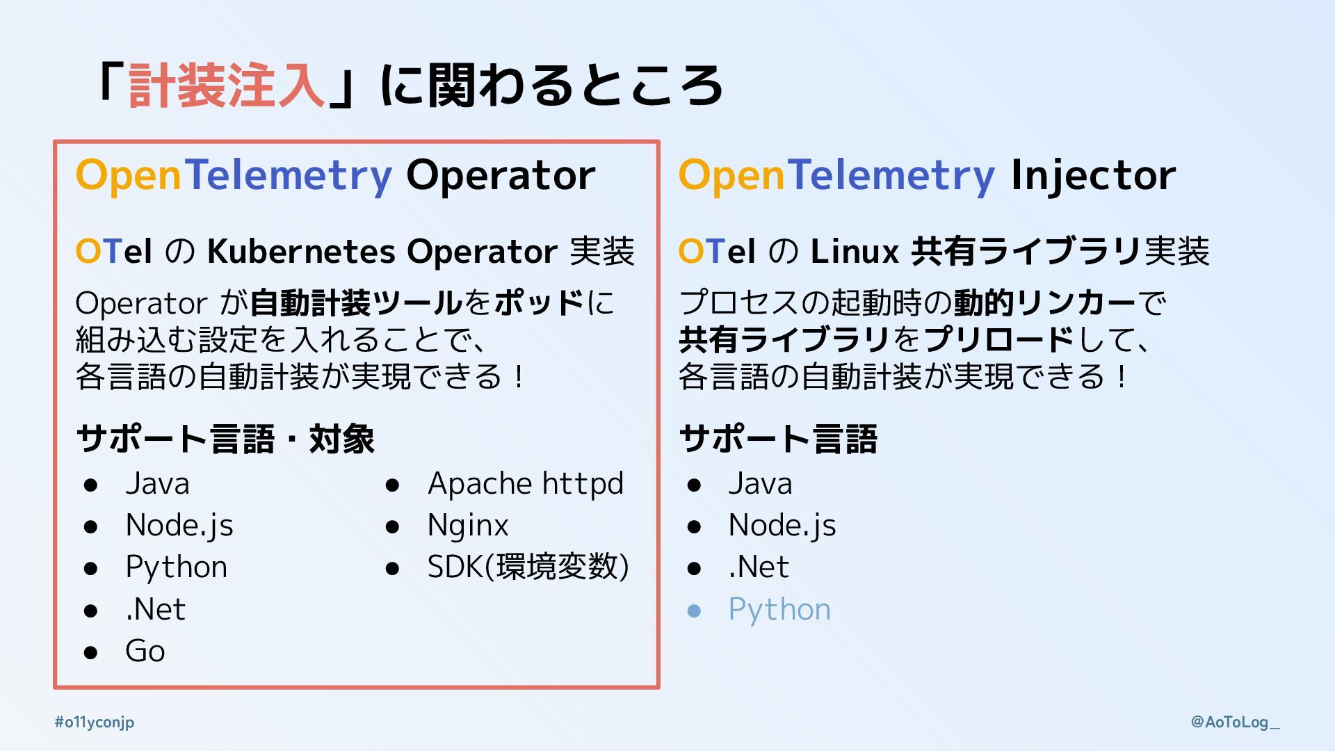 @AoToLog_ #o11yconjp 「計装注入」の制限を知る 1. 自動計装が確立している言語のみ「計装注入」ができる ◦ 「計装注入」はあくまでも自動計装が前提 ◦ 「計装注入」の方式によっては自動計装ができないこともある 2.