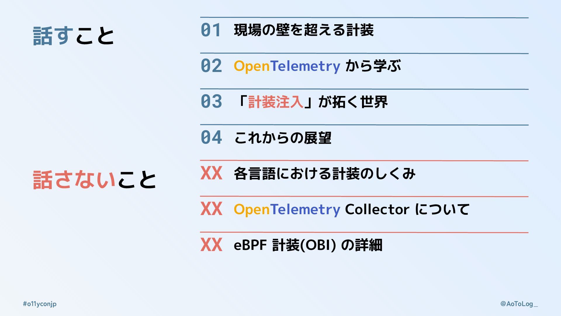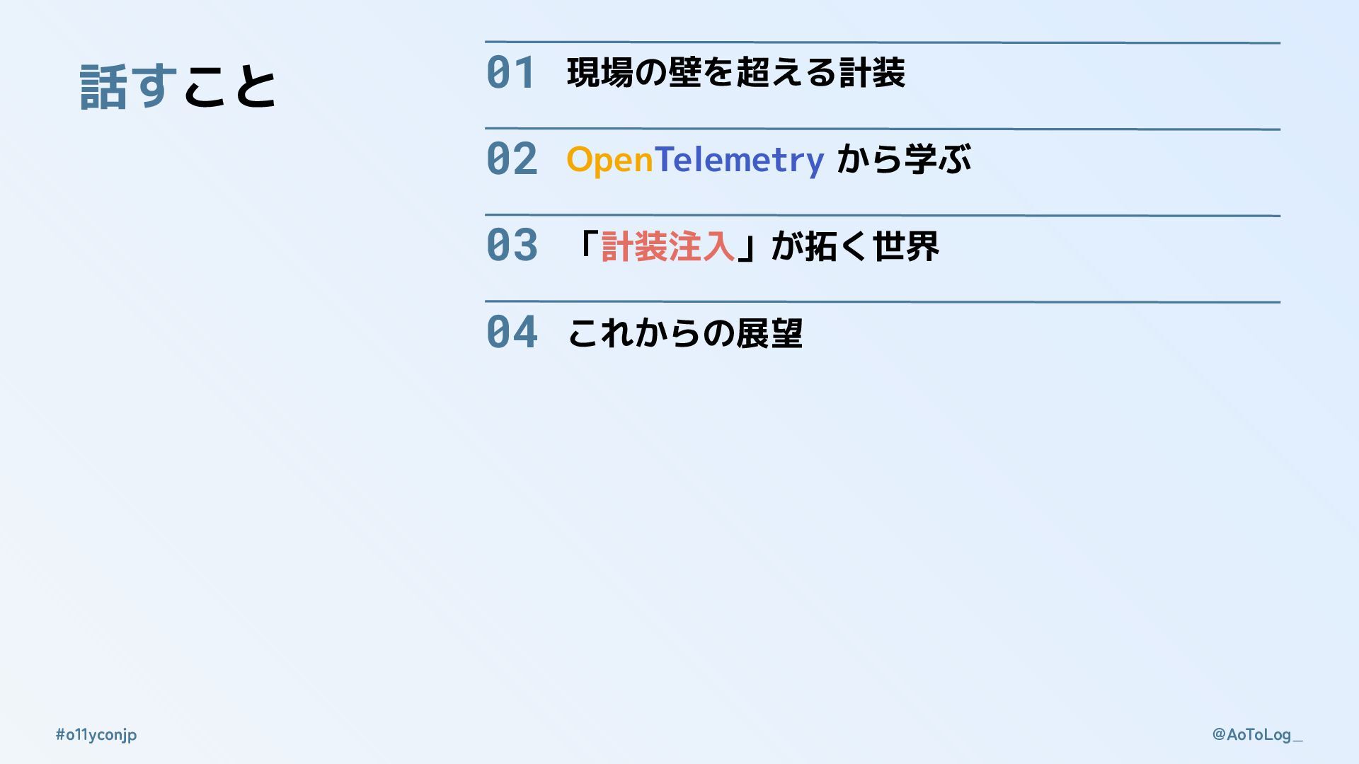 @AoToLog_ #o11yconjp 01 現場の壁を超える計装 04 これからの展望 03 「計装注入」が拓く世界 02 OpenTelemetry