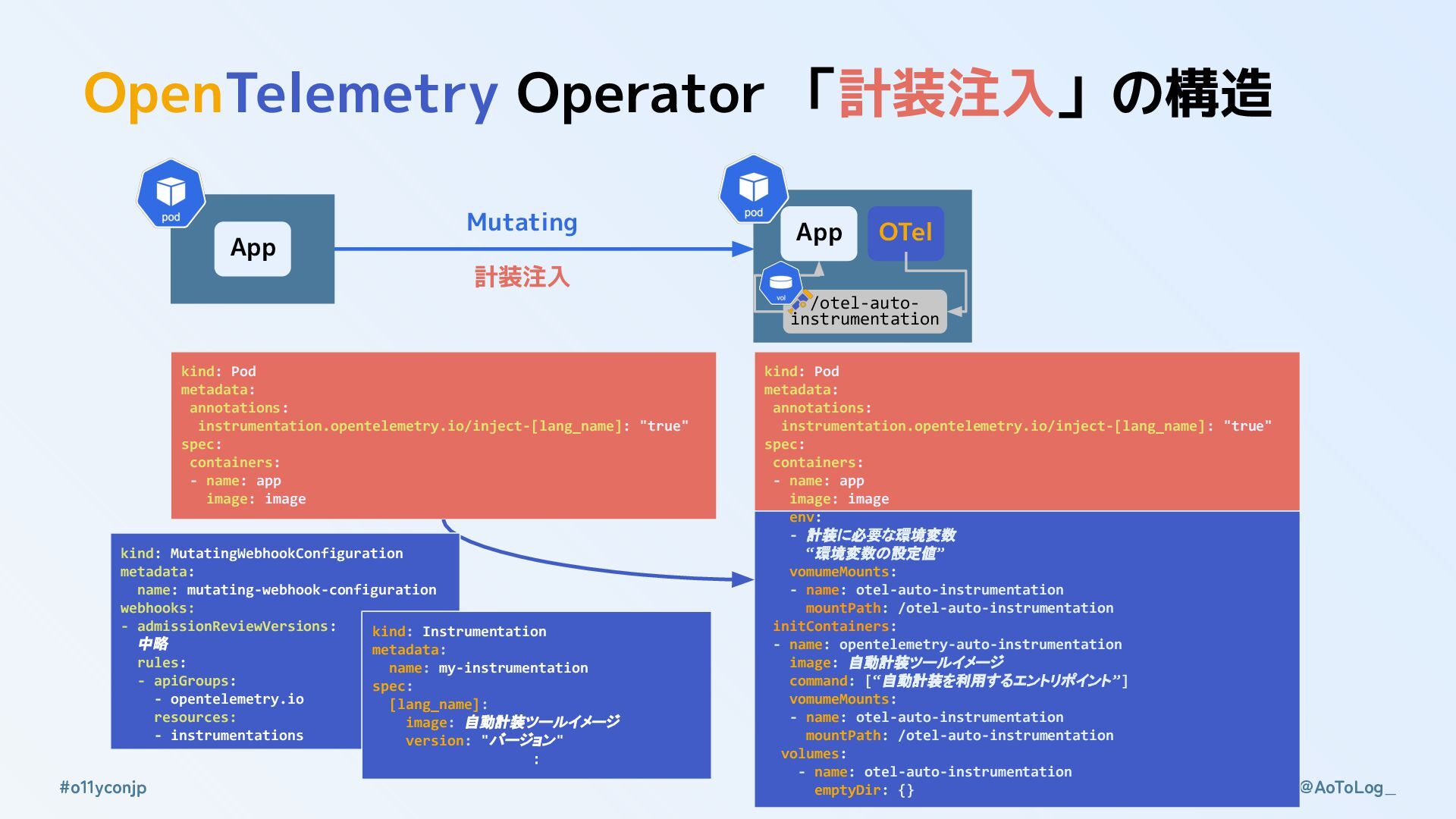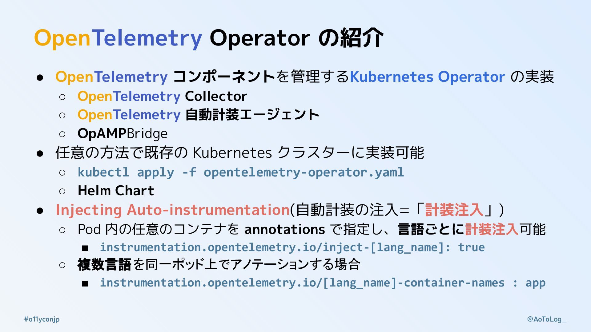 @AoToLog_ #o11yconjp 「計装注入」に関わるところ OpenTelemetry Operator OTel の Kubernetes Operator 実装