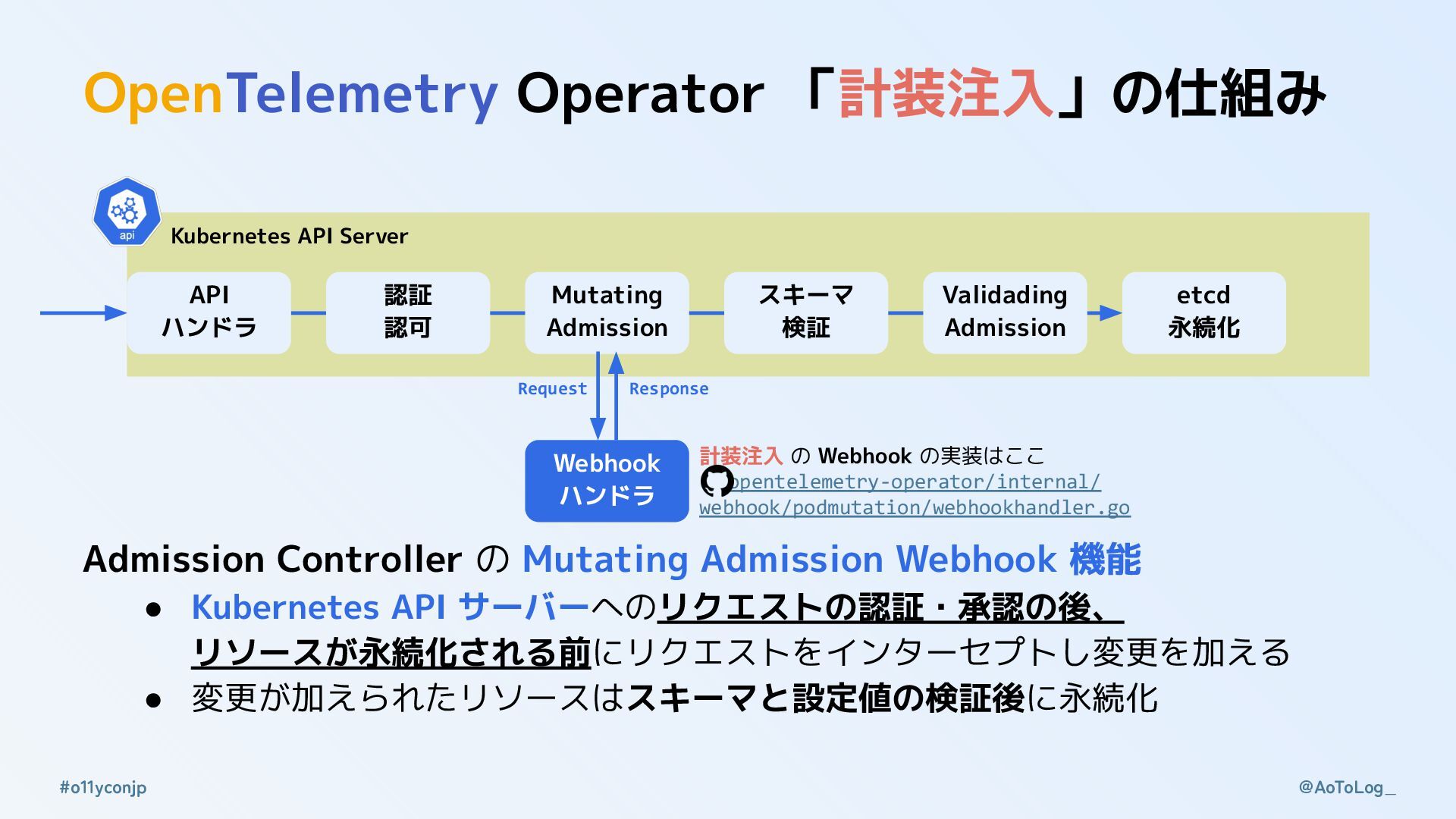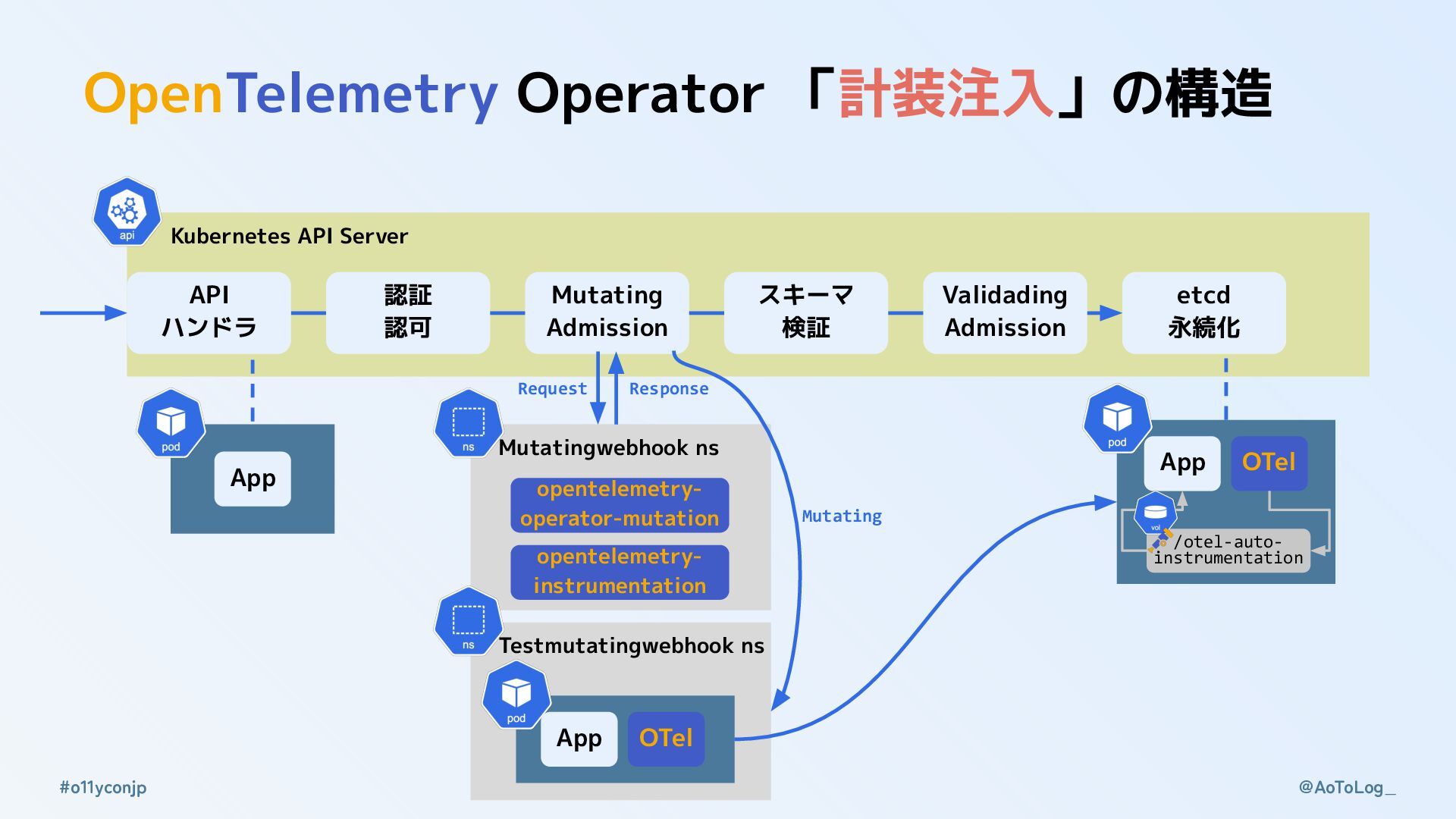 @AoToLog_ #o11yconjp Kubernetes API Server OpenTelemetry Operator 「計装注入」の構造 API ハンドラ