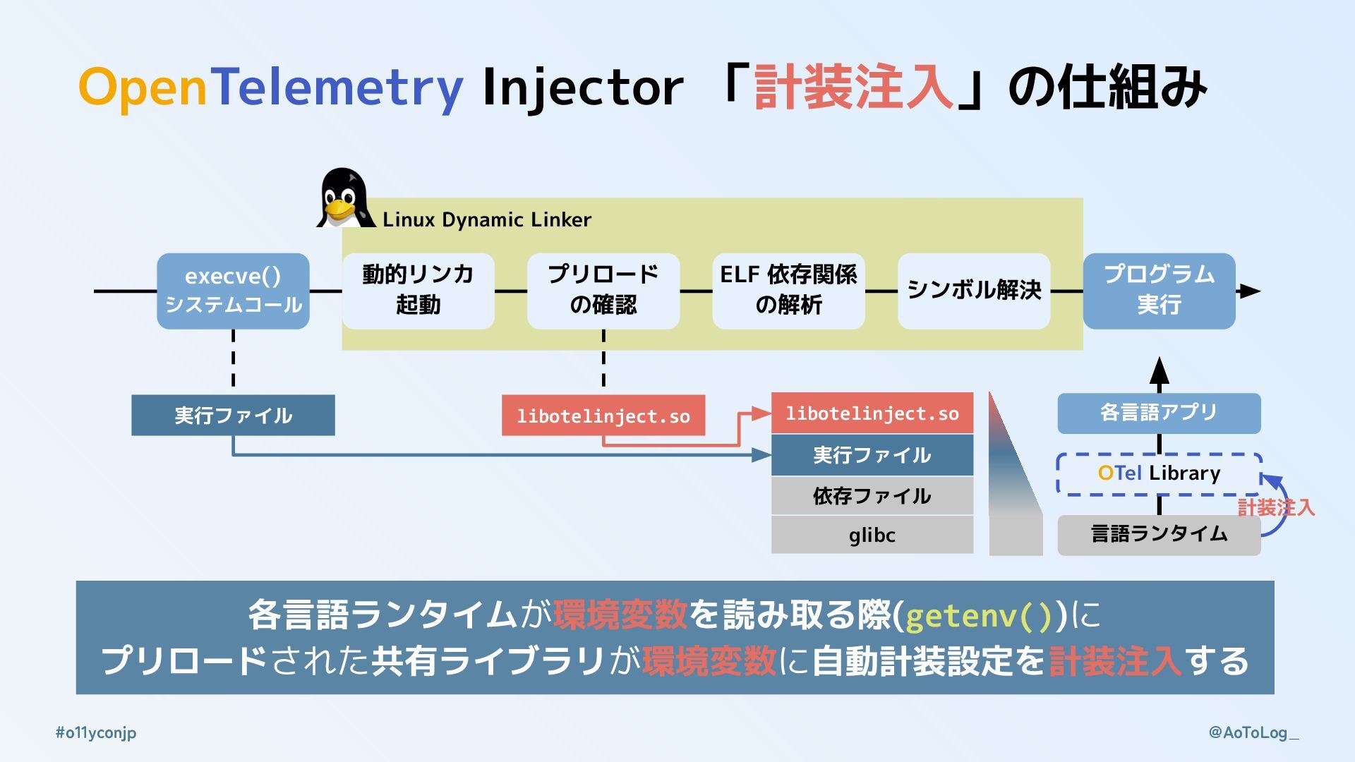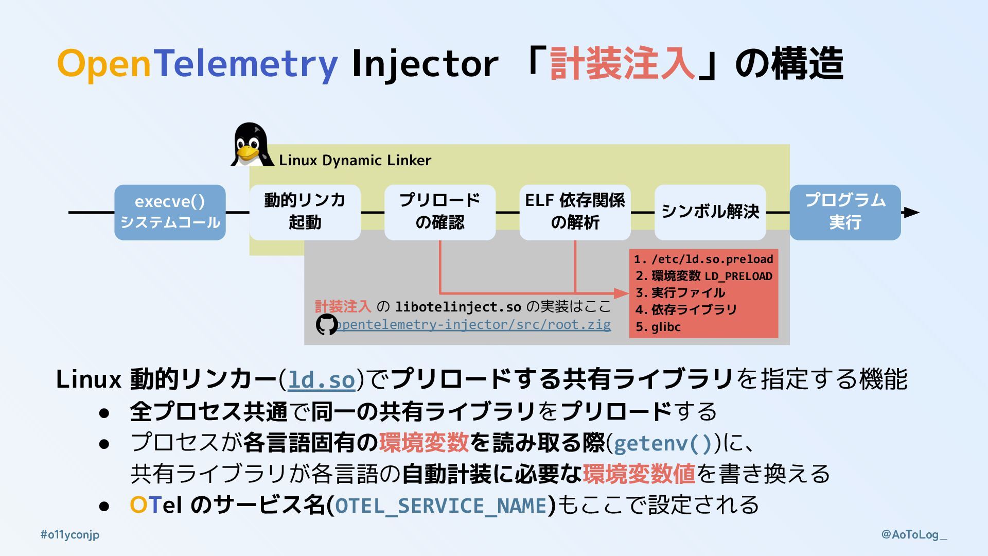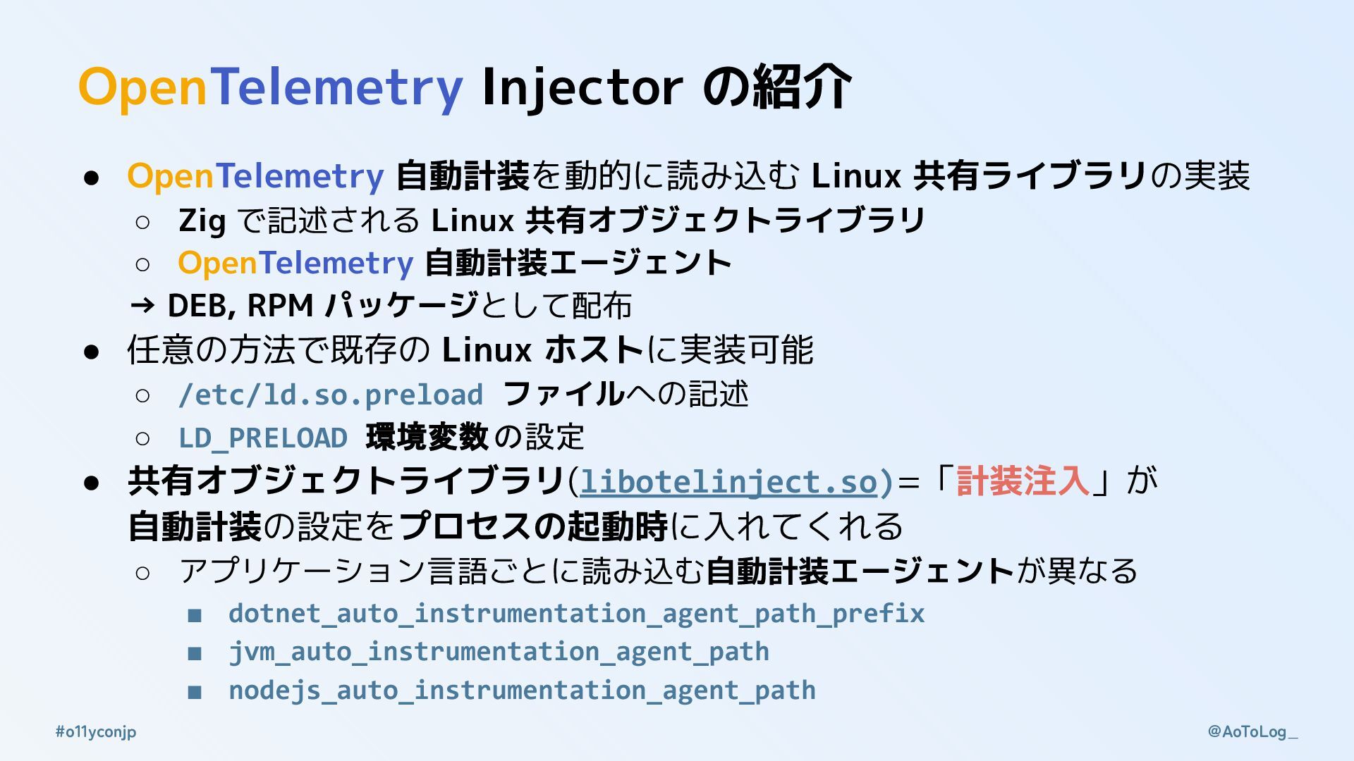 @AoToLog_ #o11yconjp OpenTelemetry Injector 「計装注入」の構造 Linux 動的リンカー(ld.so)でプリロードする共有ライブラリを指定する機能 • 全プロセス共通で同一の共有ライブラリをプリロードする •