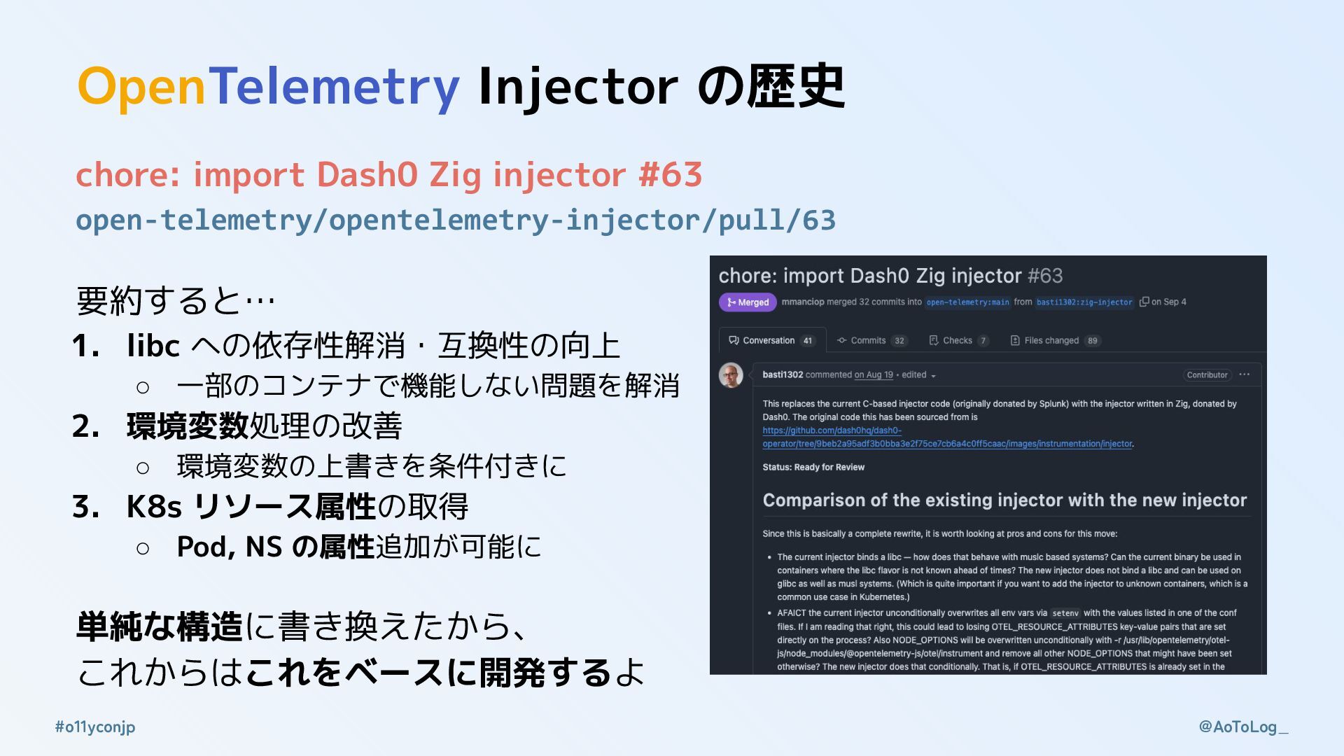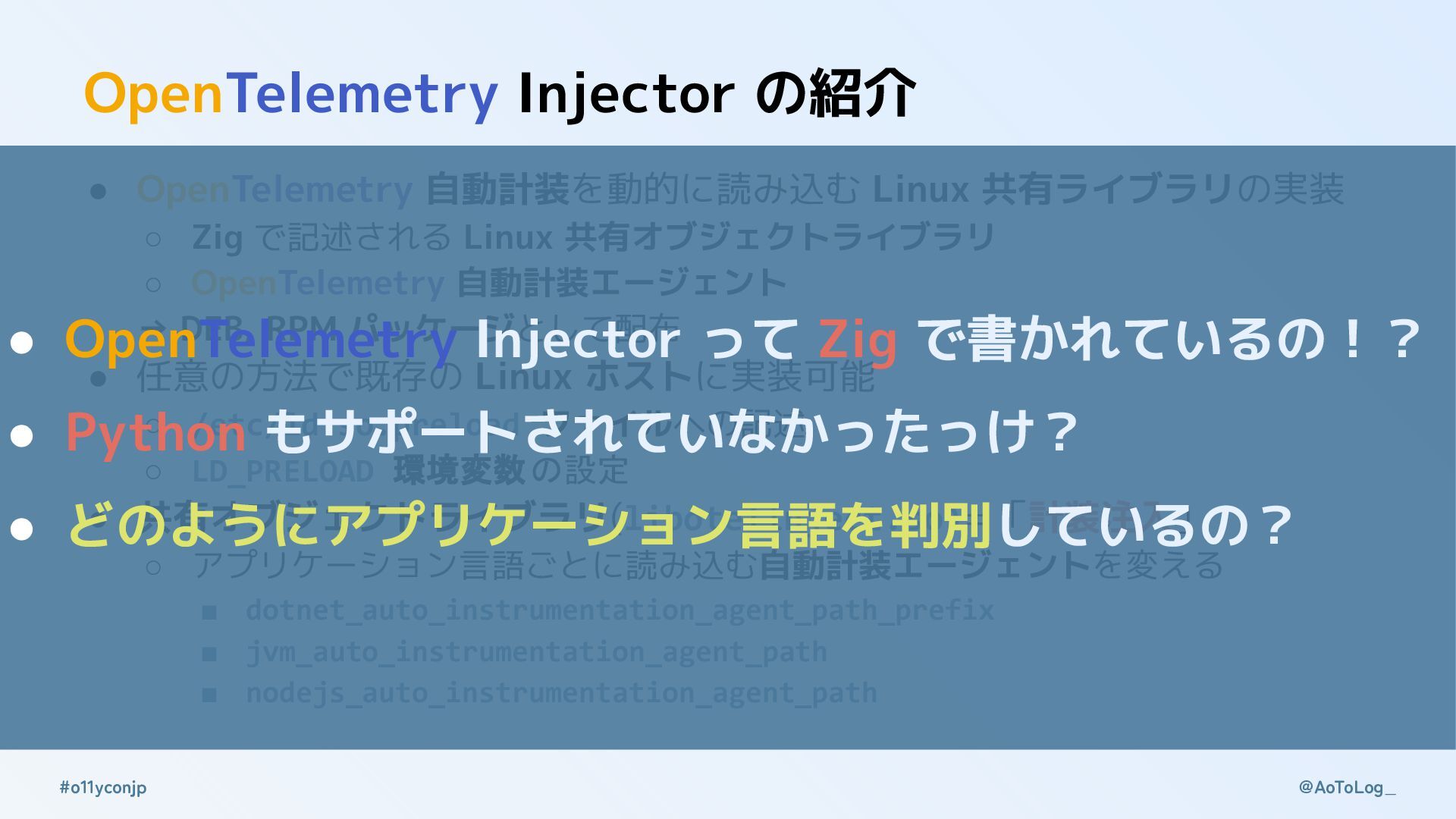 @AoToLog_ #o11yconjp OpenTelemetry Injector と本セッションの歴史 • OpenTelemetry 自動計装を動的に読み込む Linux 共有ライブラリの実装