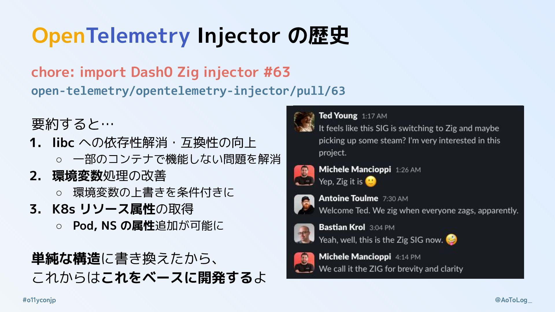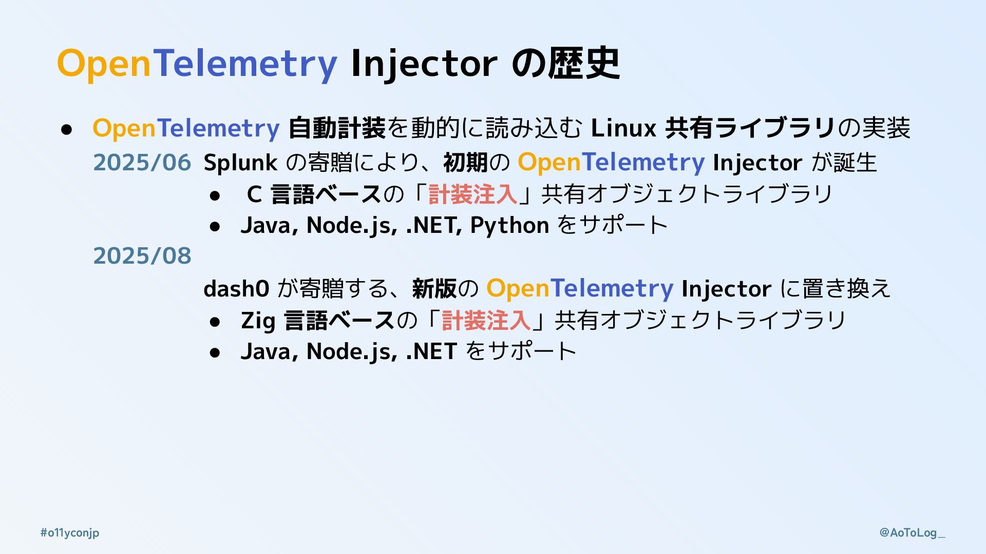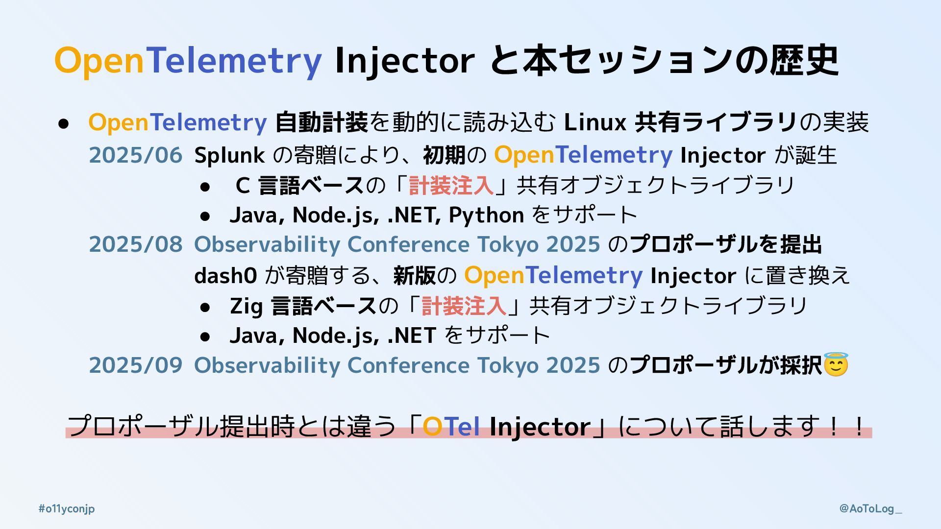 2025/06 Splunk の寄贈により、初期の OpenTelemetry Injector が誕生 • C 言語ベースの「計装注入」共有オブジェクトライブラリ • Java, Node.js, .NET, Python をサポート 2025/08 Observability Conference Tokyo 2025 のプロポーザルを提出 dash0 が寄贈する、新版の OpenTelemetry Injector に置き換え • Zig 言語ベースの「計装注入」共有オブジェクトライブラリ • Java, Node.js, .NET をサポート 2025/09 Observability Conference Tokyo 2025 のプロポーザルが採択😇 プロポーザル提出時とは違う「OTel Injector」について話します!!