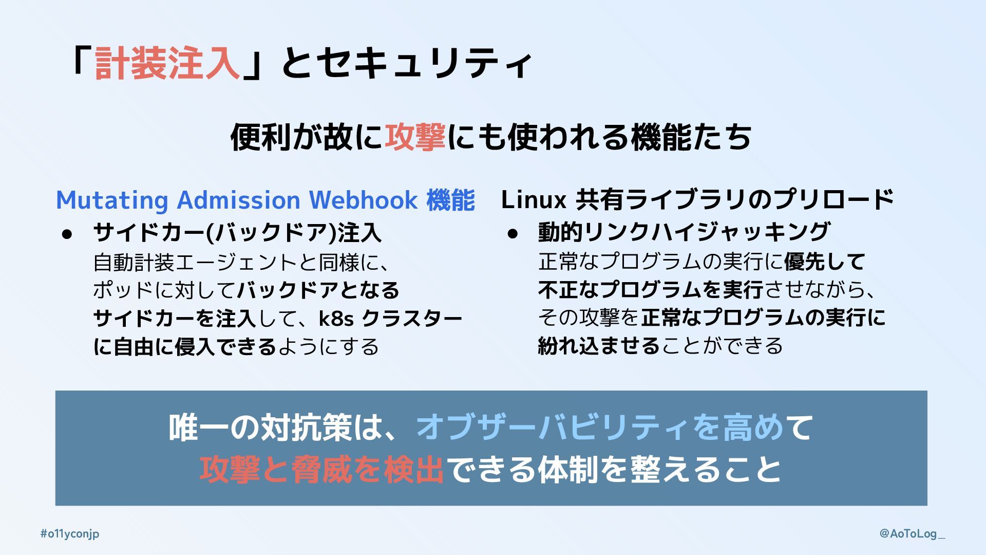 ポッドに対してバックドアとなる サイドカーを注入して、k8s クラスター に自由に侵入できるようにする Linux 共有ライブラリのプリロード • 動的リンクハイジャッキング 正常なプログラムの実行に優先して 不正なプログラムを実行させながら、 その攻撃を正常なプログラムの実行に 紛れ込ませることができる 便利が故に攻撃にも使われる機能たち 唯一の対抗策は、オブザーバビリティを高めて 攻撃と脅威を検出できる体制を整えること