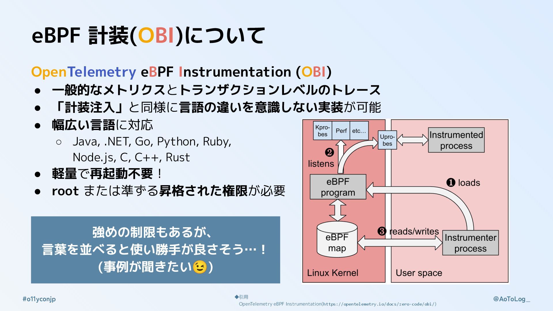 @AoToLog_ #o11yconjp eBPF 計装(OBI)について OpenTelemetry eBPF Instrumentation (OBI) • 一般的なメトリクスとトランザクションレベルのトレース