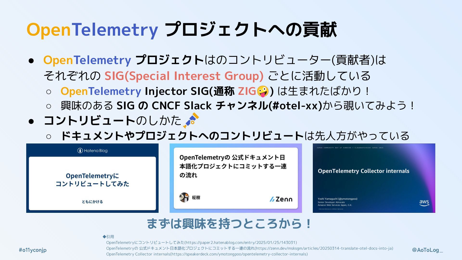 Group) ごとに活動している ◦ OpenTelemetry Injector SIG(通称 ZIG🤪) は生まれたばかり! ◦ 興味のある SIG の CNCF Slack チャンネル(#otel-xx)から覗いてみよう! • コントリビュートのしかた ◦ ドキュメントやプロジェクトへのコントリビュートは先人方がやっている 、 まずは興味を持つところから! ◆引用 OpenTelemetryにコントリビュートしてみた(https://paper2.hatenablog.com/entry/2025/01/25/143031) OpenTelemetryの 公式ドキュメント日本語化プロジェクトにコミットする一連の流れ(https://zenn.dev/msksgm/articles/20250314-translate-otel-docs-into-ja) OpenTelemetry Collector internals(https://speakerdeck.com/ymotongpoo/opentelemetry-collector-internals)