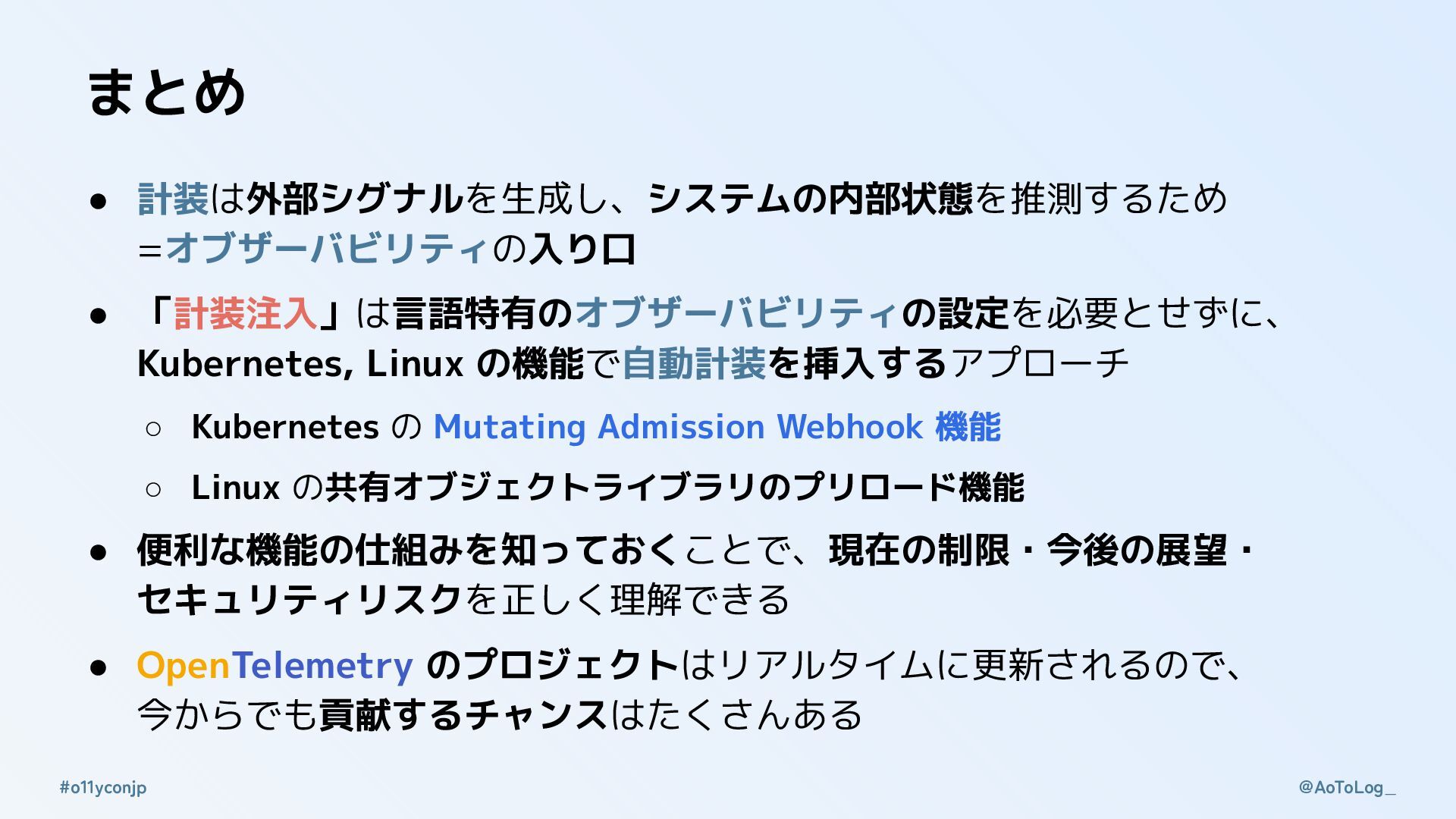 @AoToLog_ #o11yconjp まとめ • 計装は外部シグナルを生成し、システムの内部状態を推測するため =オブザーバビリティの入り口 • 「計装注入」は言語特有のオブザーバビリティの設定を必要とせずに、 Kubernetes, Linux