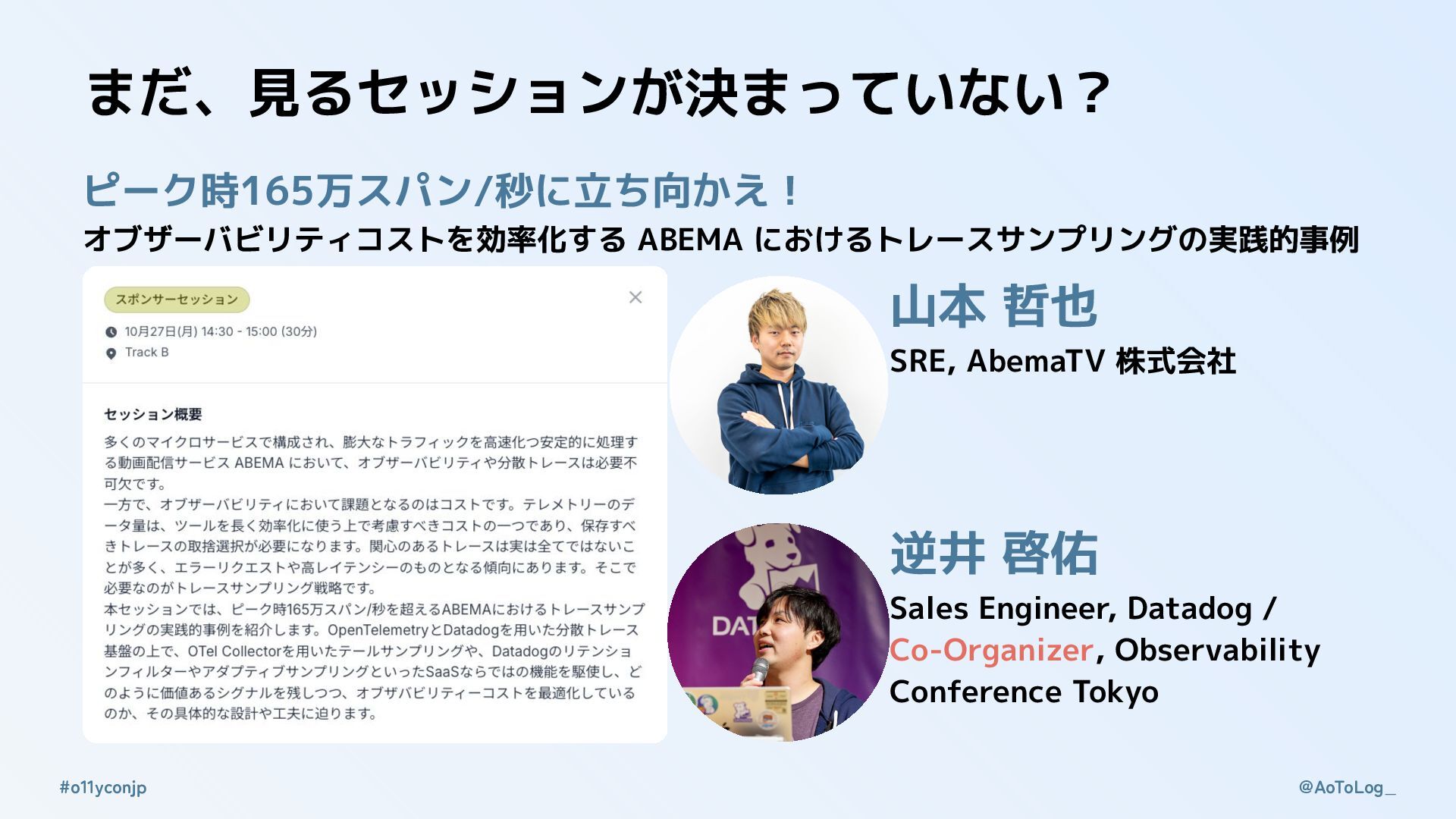 @AoToLog_ #o11yconjp まだ、見るセッションが決まっていない? ピーク時165万スパン/秒に立ち向かえ! オブザーバビリティコストを効率化する ABEMA におけるトレースサンプリングの実践的事例 山本 哲也 SRE,
