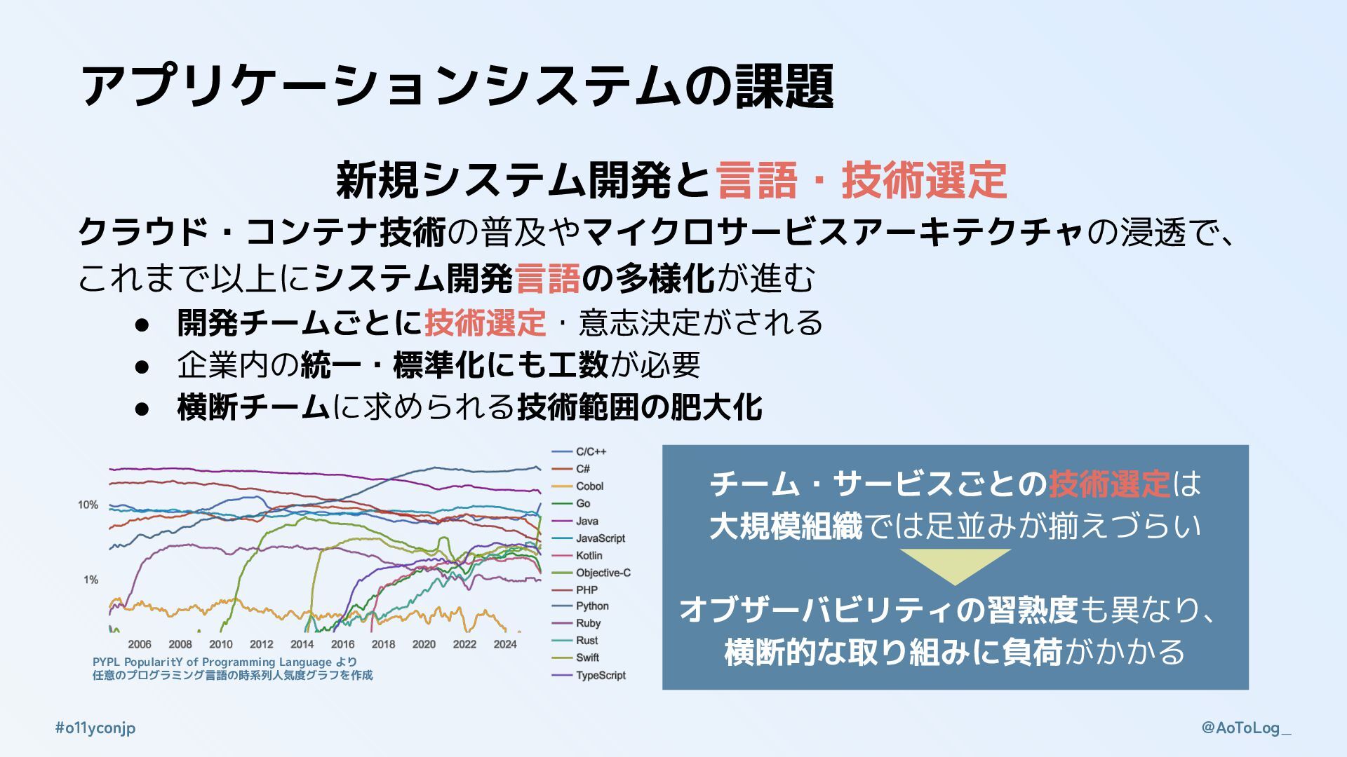 @AoToLog_ #o11yconjp アプリケーションシステムの課題 新規システム開発と言語・技術選定 クラウド・コンテナ技術の普及やマイクロサービスアーキテクチャの浸透で、 これまで以上にシステム開発言語の多様化が進む • 開発チームごとに技術選定・意志決定がされる • 企業内の統一・標準化にも工数が必要