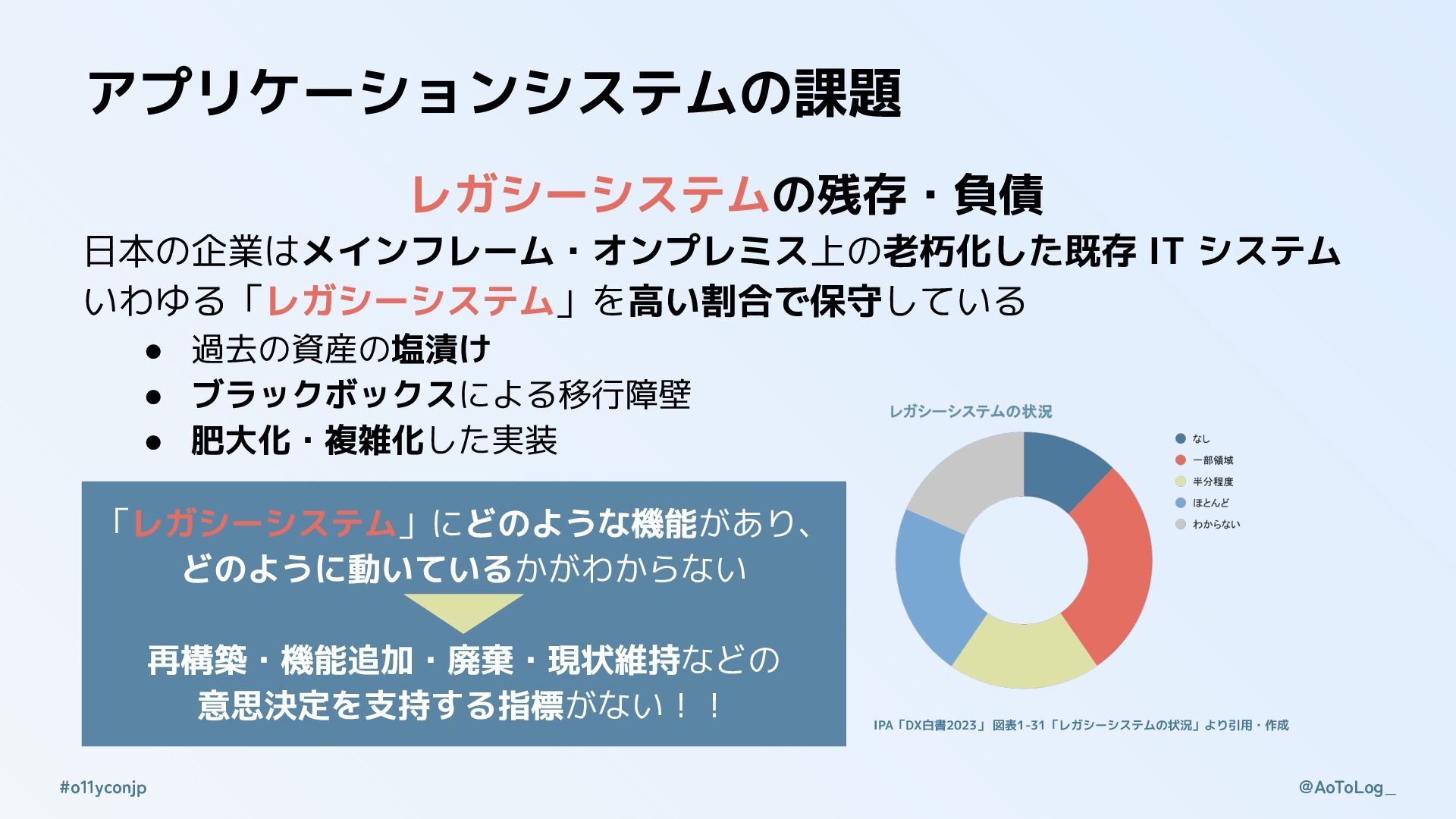 @AoToLog_ #o11yconjp アプリケーションシステムの課題 レガシーシステムの残存・負債 日本の企業はメインフレーム・オンプレミス上の老朽化した既存 IT システム いわゆる「レガシーシステム」を高い割合で保守している • 過去の資産の塩漬け
