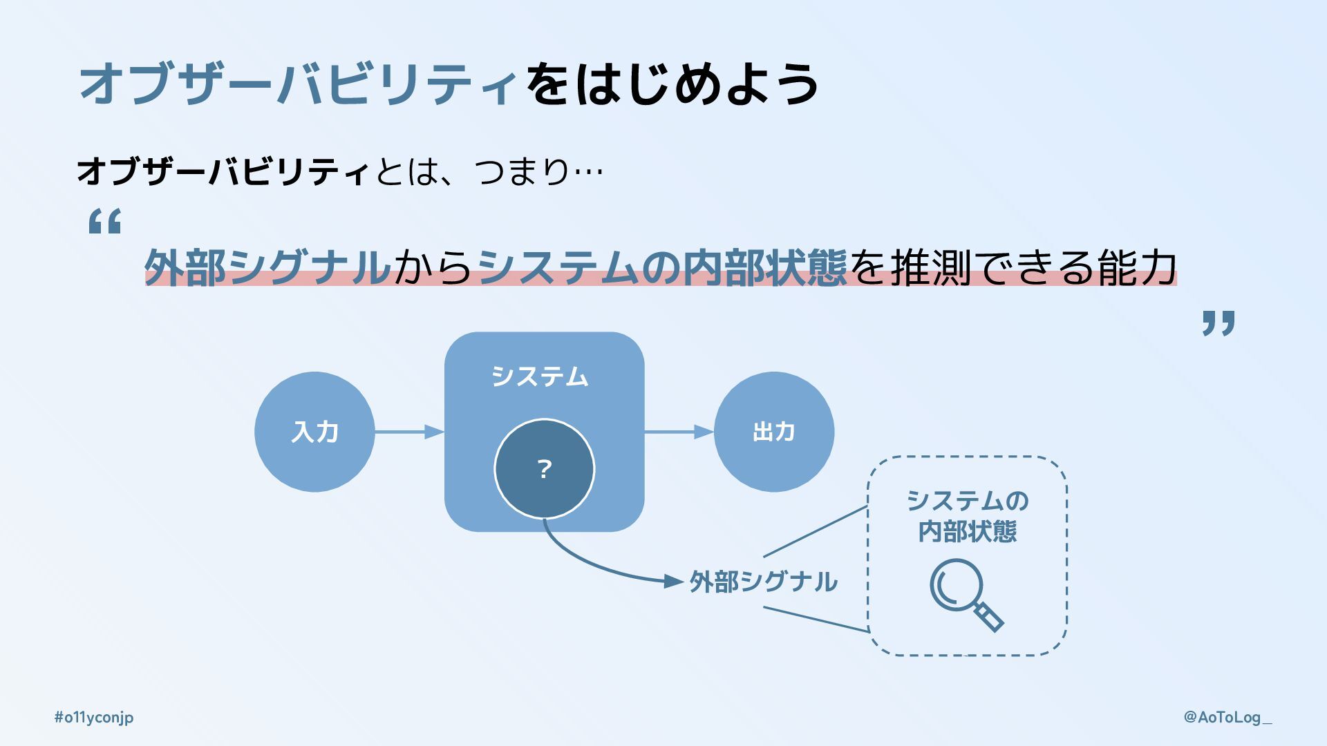 @AoToLog_ #o11yconjp オブザーバビリティをはじめよう オブザーバビリティとは、つまり… 外部シグナルからシステムの内部状態を推測できる能力 システム ? 外部シグナル システムの 内部状態