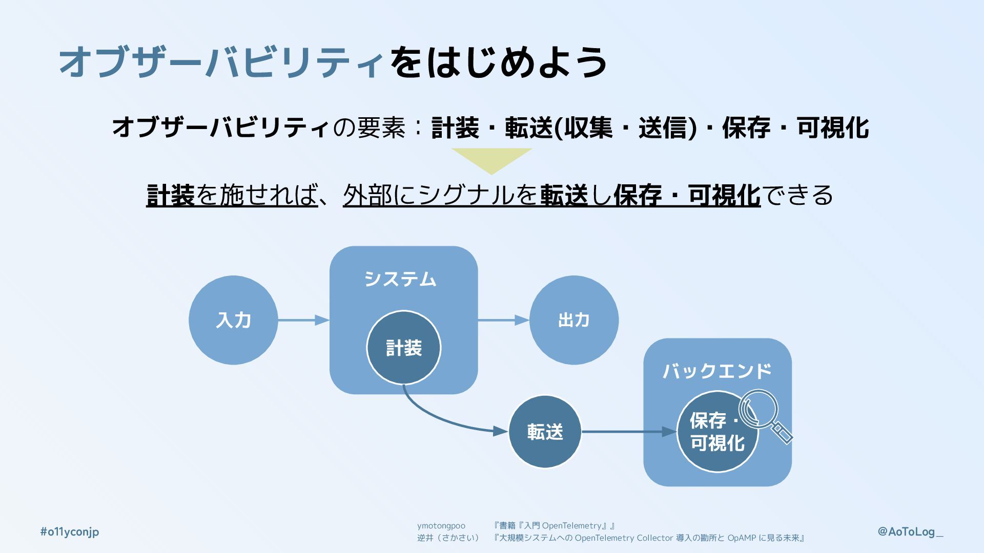 @AoToLog_ #o11yconjp オブザーバビリティをはじめよう オブザーバビリティの要素:計装・転送(収集・送信)・保存・可視化 計装を施せれば、外部にシグナルを転送し保存・可視化できる 入力 出力 システム 計装 転送