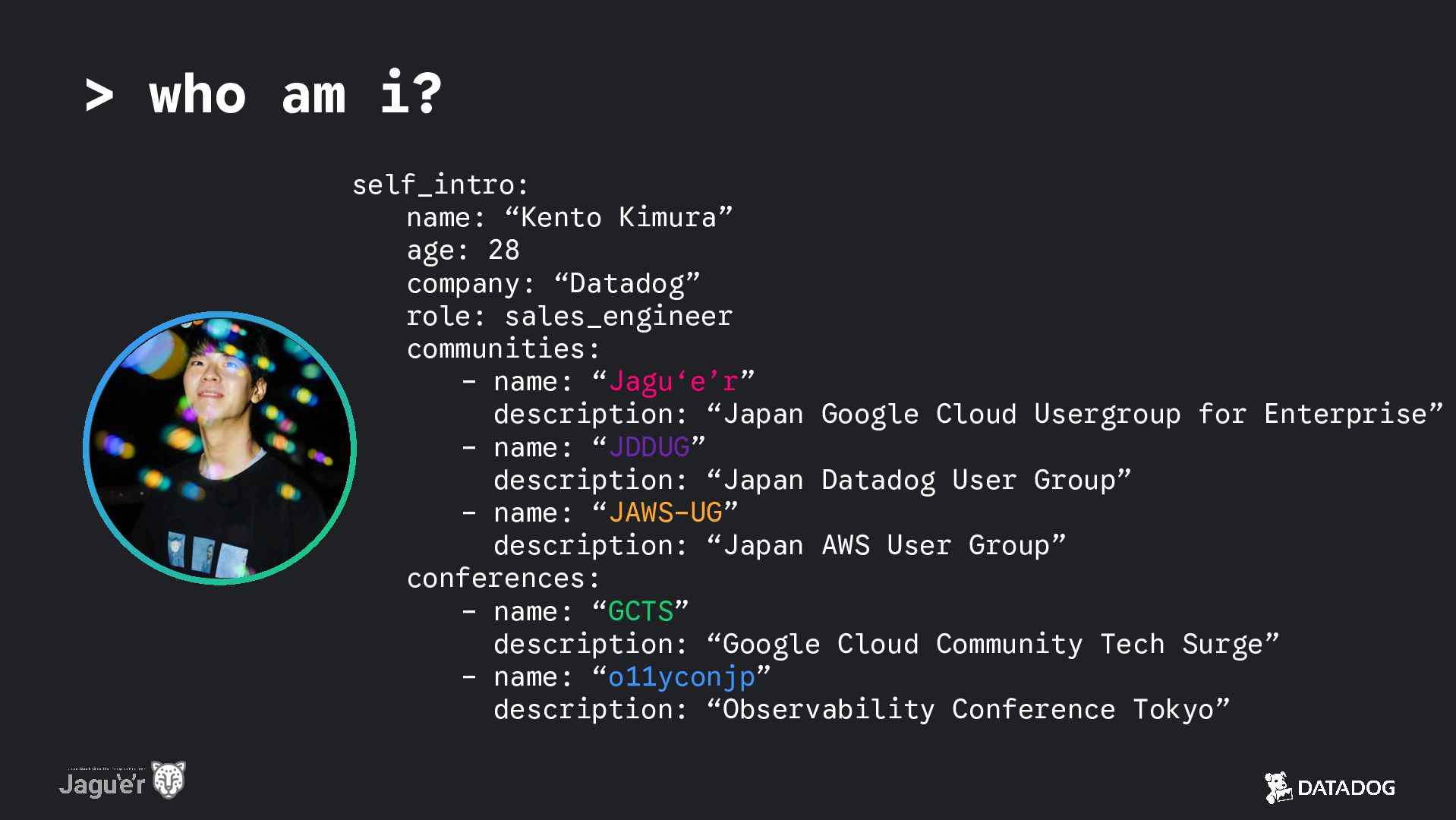 company: “Datadog” role: sales_engineer communities: - name: “Jagu‘e’r” description: “Japan Google Cloud Usergroup for Enterprise” - name: “JDDUG” description: “Japan Datadog User Group” - name: “JAWS-UG” description: “Japan AWS User Group” conferences: - name: “GCTS” description: “Google Cloud Community Tech Surge” - name: “o11yconjp” description: “Observability Conference Tokyo”