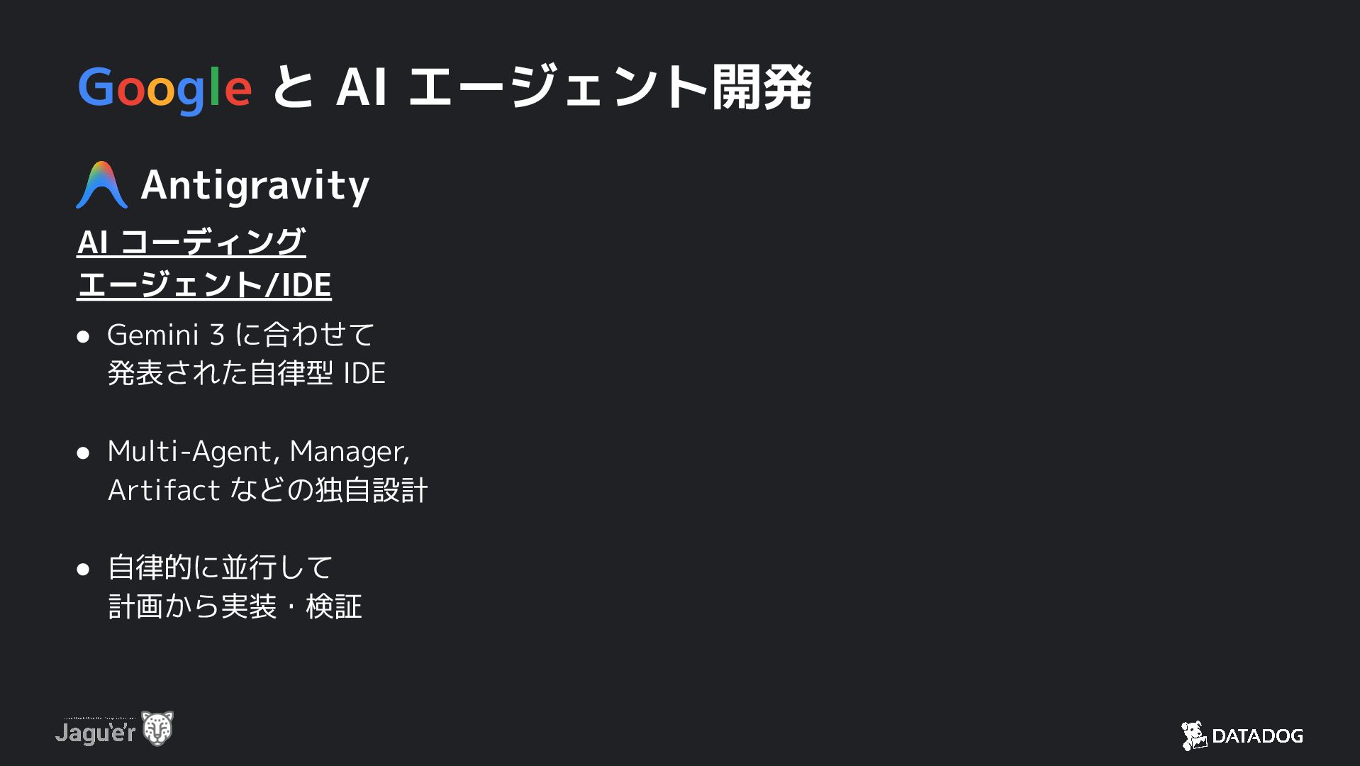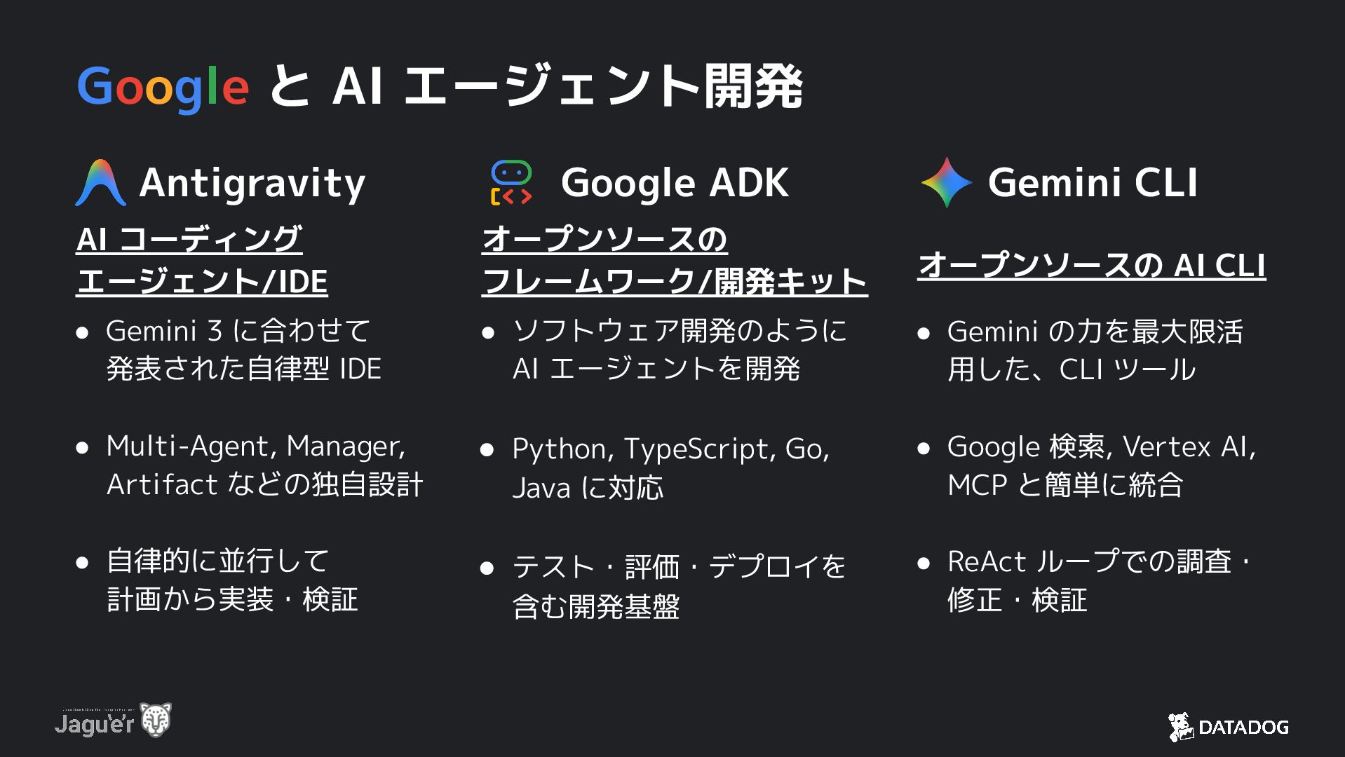 3 に合わせて 発表された自律型 IDE • Multi-Agent, Manager, Artifact などの独自設計 • 自律的に並行して 計画から実装・検証 Google ADK オープンソースの フレームワーク/開発キット • ソフトウェア開発のように AI エージェントを開発 • Python, TypeScript, Go, Java に対応 • テスト・評価・デプロイを 含む開発基盤 Gemini CLI オープンソースの AI CLI • Gemini の力を最大限活 用した、CLI ツール • Google 検索, Vertex AI, MCP と簡単に統合 • ReAct ループでの調査・ 修正・検証