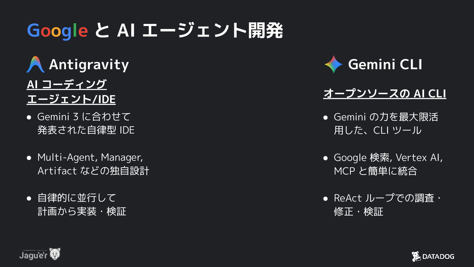 3 に合わせて 発表された自律型 IDE • Multi-Agent, Manager, Artifact などの独自設計 • 自律的に並行して 計画から実装・検証 Gemini CLI オープンソースの AI CLI • Gemini の力を最大限活 用した、CLI ツール • Google 検索, Vertex AI, MCP と簡単に統合 • ReAct ループでの調査・ 修正・検証