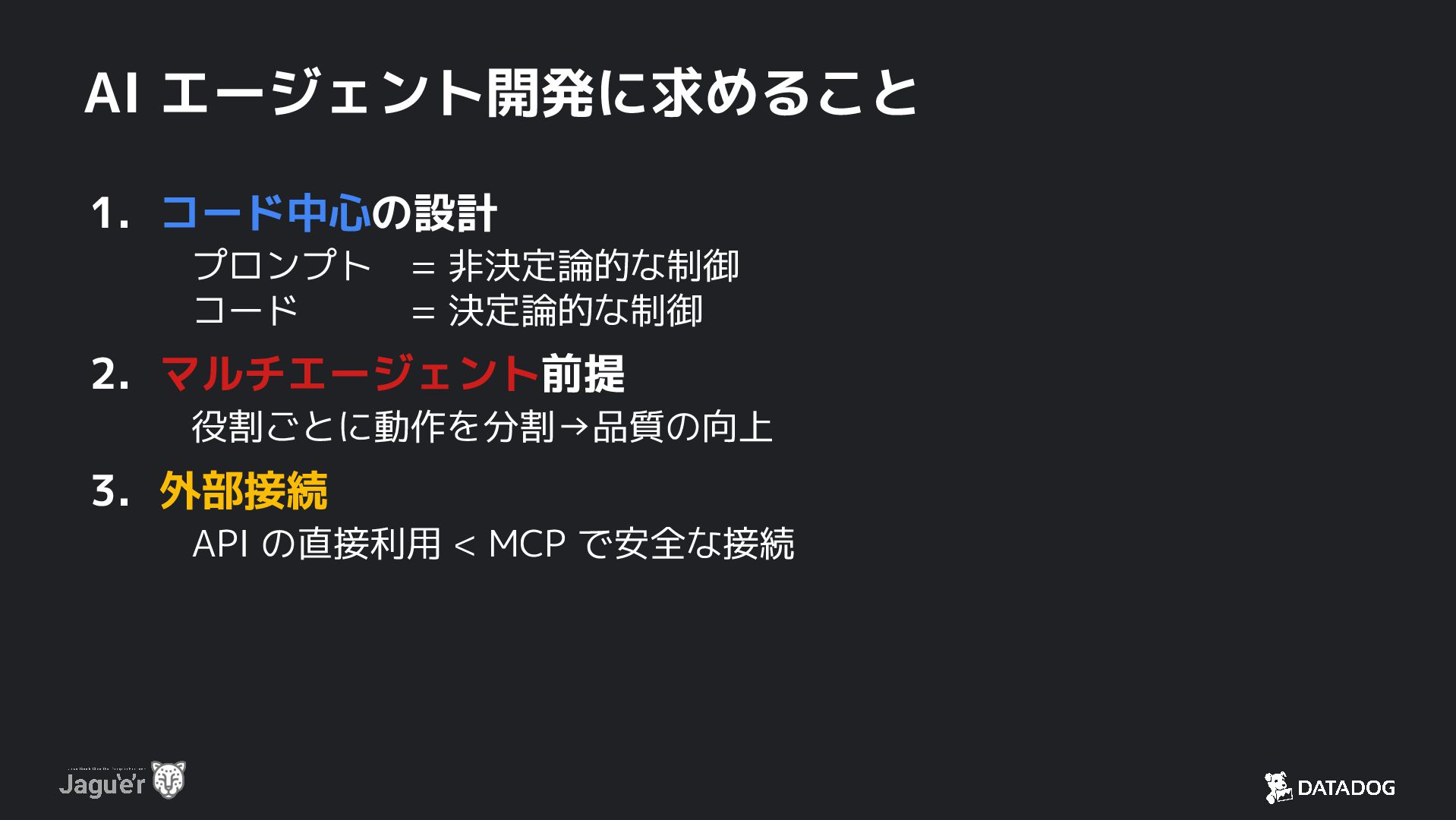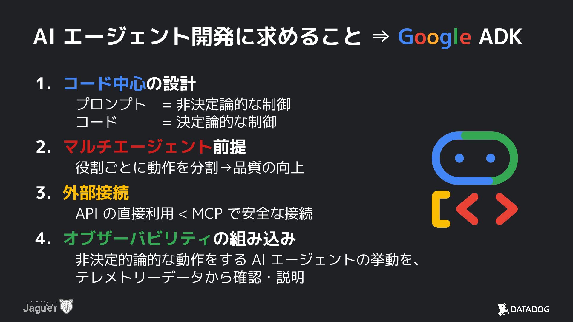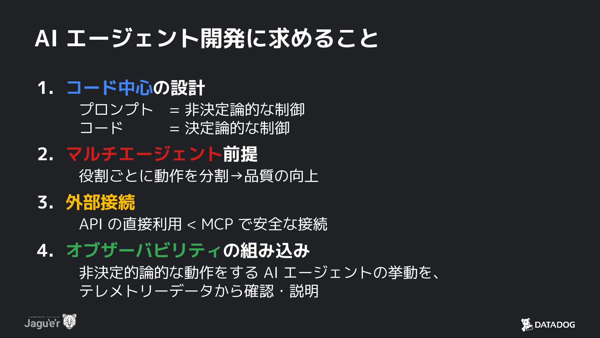 コード = 決定論的な制御 2. マルチエージェント前提 役割ごとに動作を分割→品質の向上 3. 外部接続 API の直接利用 < MCP で安全な接続 4. オブザーバビリティの組み込み 非決定的論的な動作をする AI エージェントの挙動を、 テレメトリーデータから確認・説明