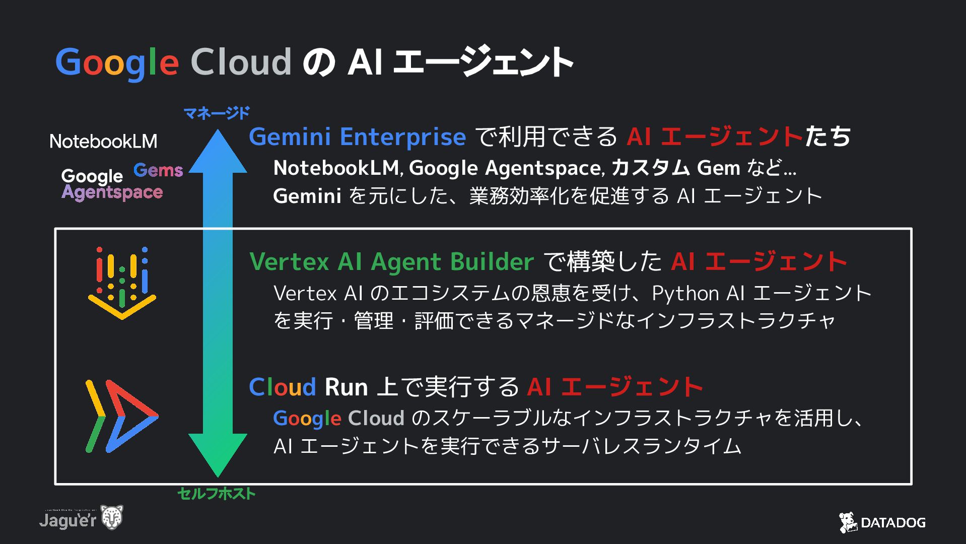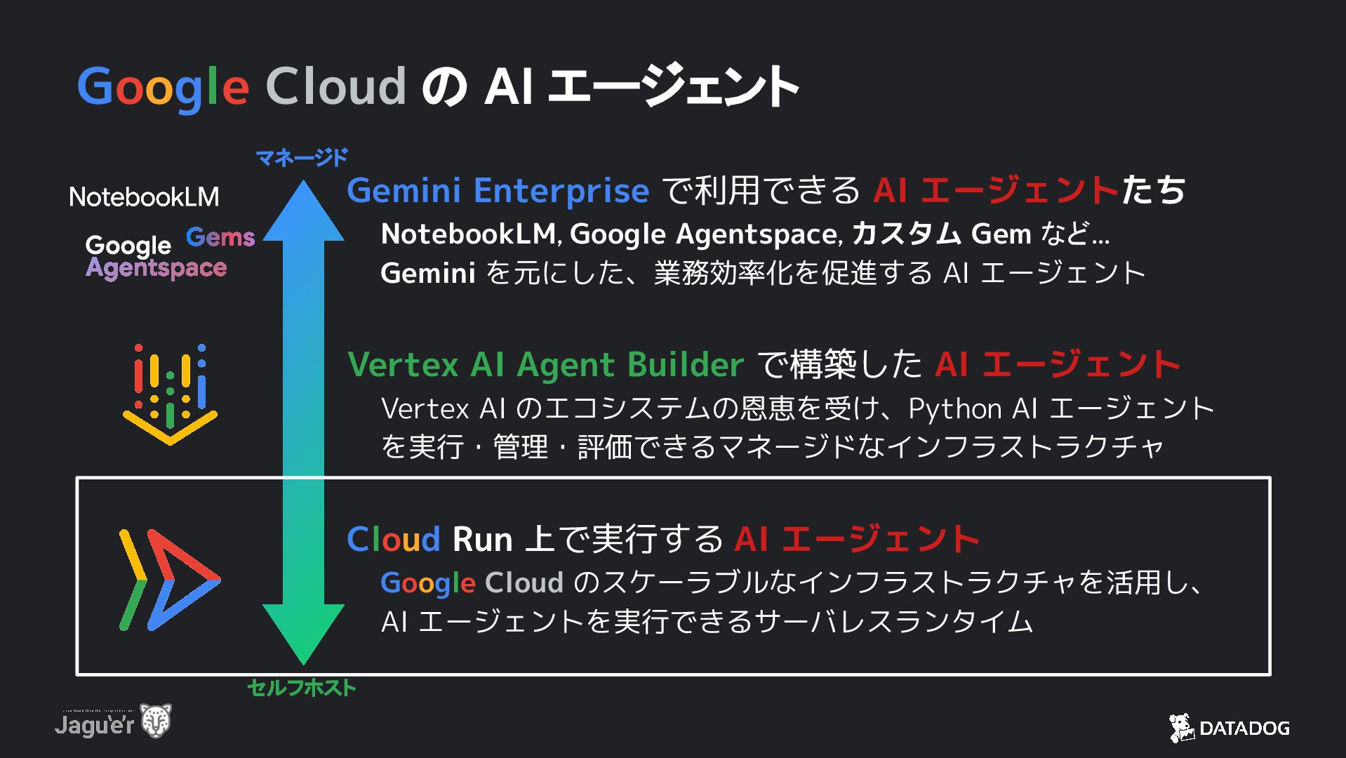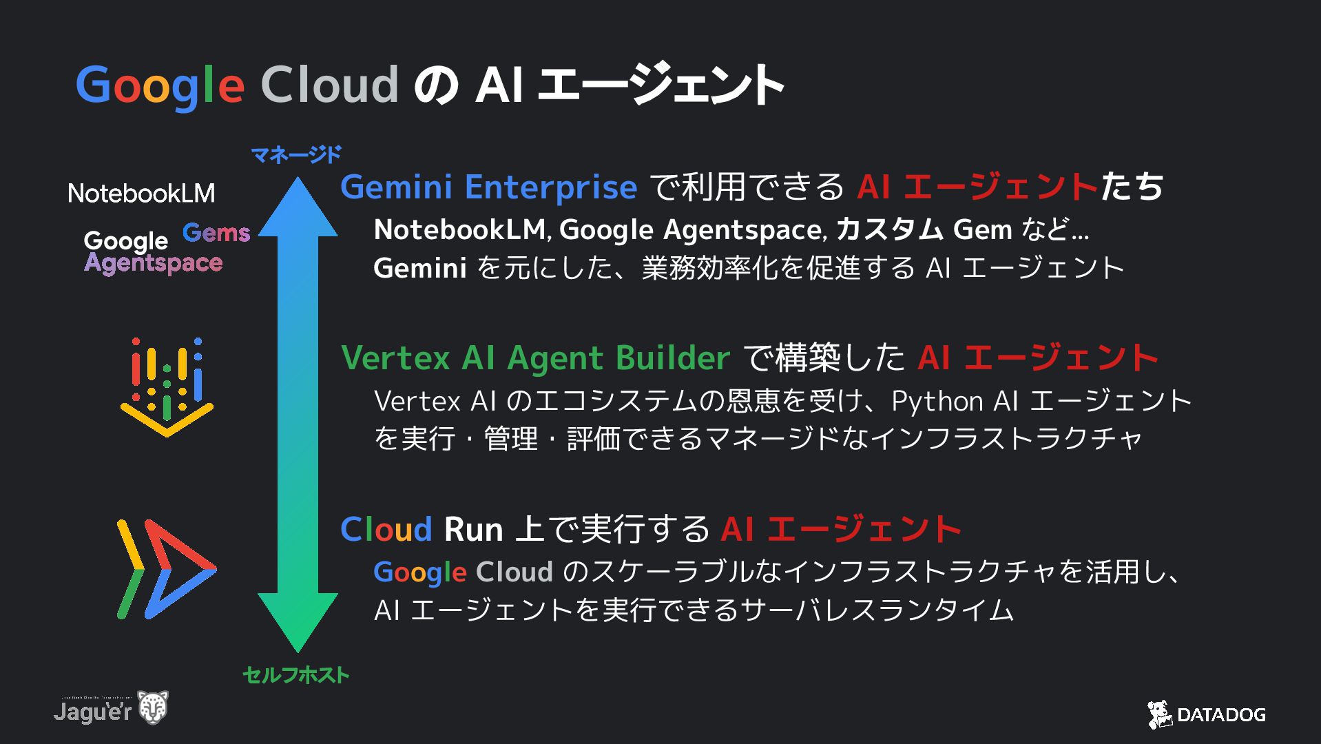 AI エージェントたち NotebookLM, Google Agentspace, カスタム Gem など… Gemini を元にした、業務効率化を促進する AI エージェント Vertex AI Agent Builder で構築した AI エージェント Vertex AI のエコシステムの恩恵を受け、Python AI エージェント を実行・管理・評価できるマネージドなインフラストラクチャ Cloud Run 上で実行する AI エージェント Google Cloud のスケーラブルなインフラストラクチャを活用し、 AI エージェントを実行できるサーバレスランタイム
