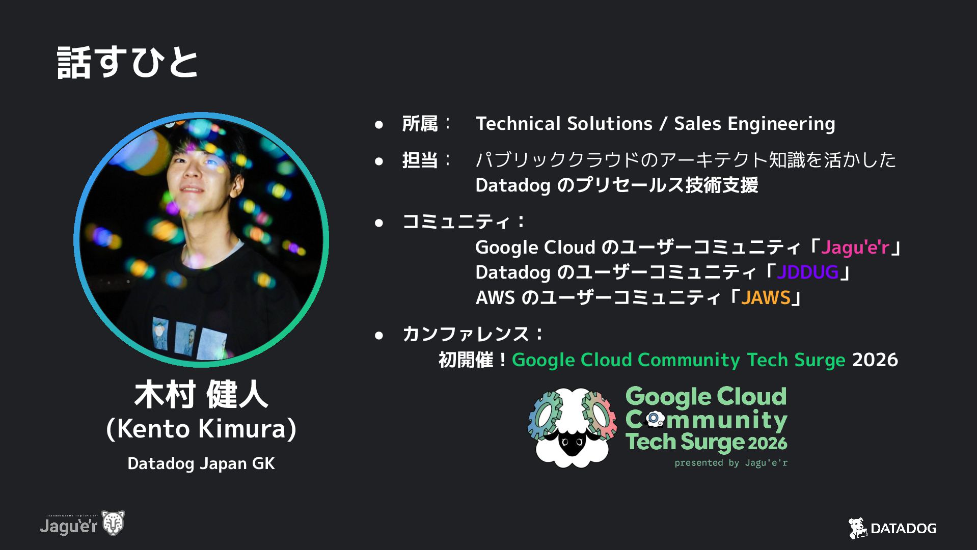 パブリッククラウドのアーキテクト知識を活かした   Datadog のプリセールス技術支援 • コミュニティ: Google Cloud のユーザーコミュニティ「Jagu'e'r」 Datadog のユーザーコミュニティ「JDDUG」 AWS のユーザーコミュニティ「JAWS」 • カンファレンス: 初開催!Google Cloud Community Tech Surge 2026 木村 健人 (Kento Kimura) Datadog Japan GK