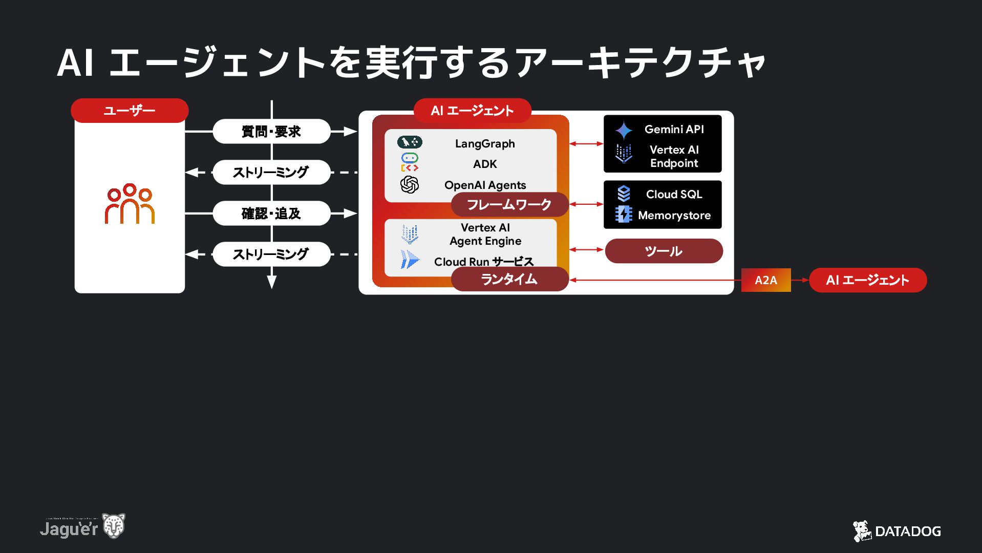 ランタイム LangGraph ADK OpenAI Agents フレームワーク Gemini API Vertex AI Endpoint Cloud SQL Memorystore AI エージェント ツール AI エージェント A2A 質問・要求 ストリーミング 確認・追及 ストリーミング