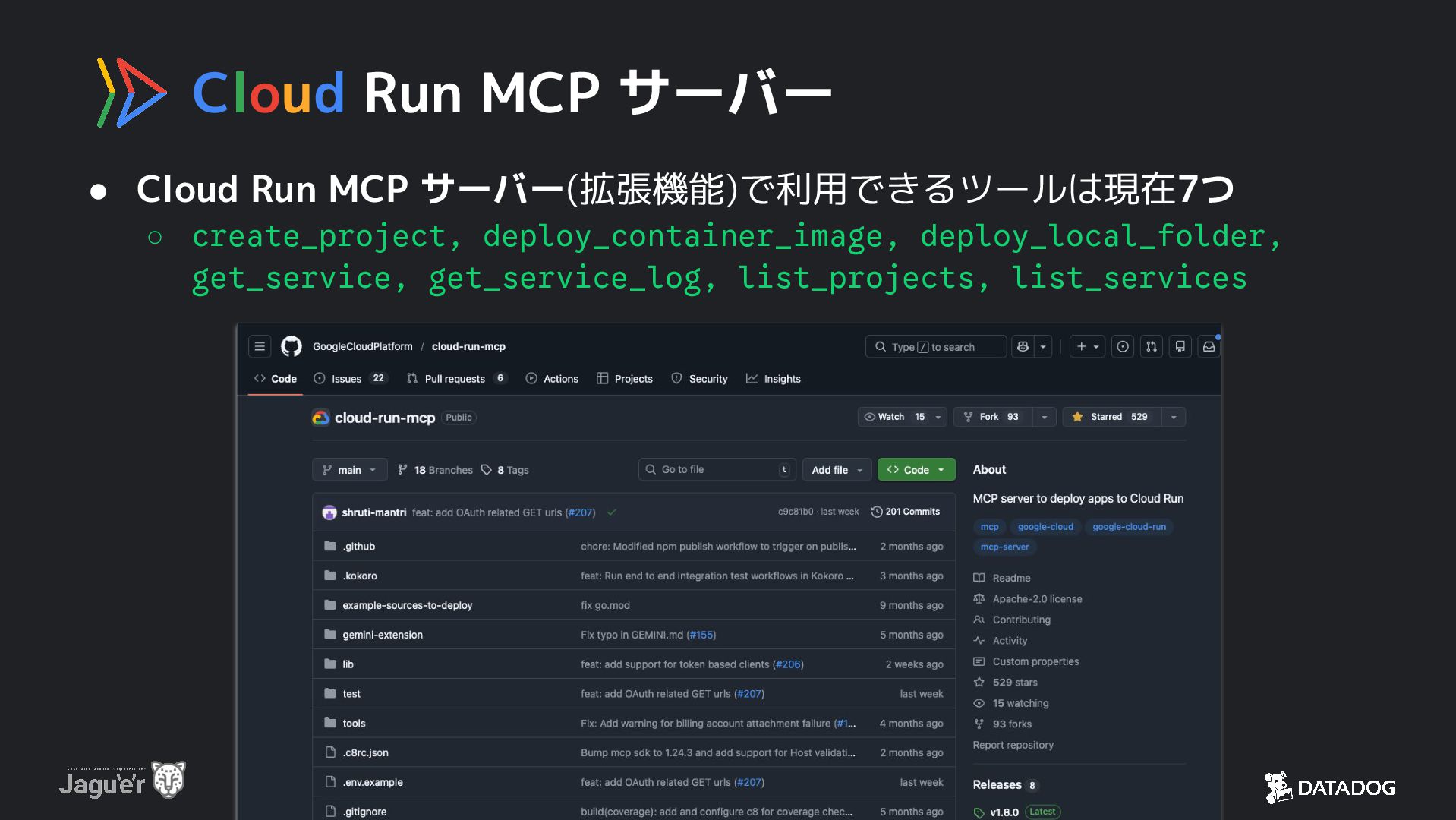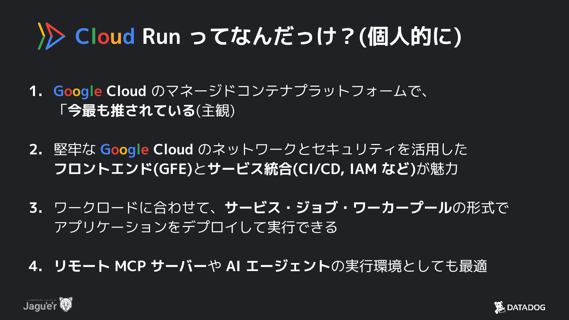 Google Cloud のネットワークとセキュリティを活用した フロントエンド(GFE)とサービス統合(CI/CD, IAM など)が魅力 3. ワークロードに合わせて、サービス・ジョブ・ワーカープールの形式で アプリケーションをデプロイして実行できる 4. リモート MCP サーバーや AI エージェントの実行環境としても最適