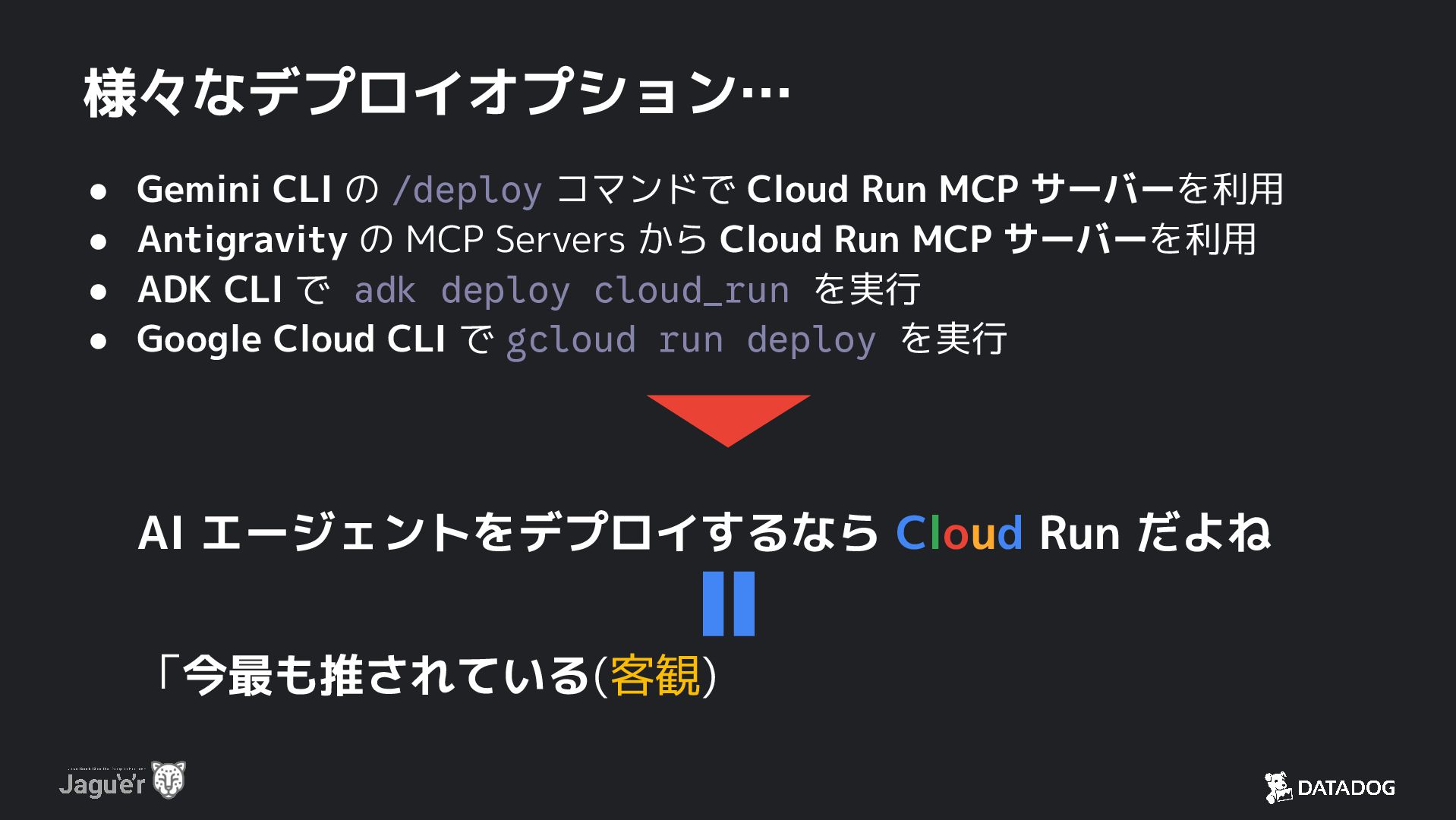 サーバーを利用 • Antigravity の MCP Servers から Cloud Run MCP サーバーを利用 • ADK CLI で adk deploy cloud_run を実行 • Google Cloud CLI で gcloud run deploy を実行 AI エージェントをデプロイするなら Cloud Run だよね 「今最も推されている(客観)」コンピューティングサービス