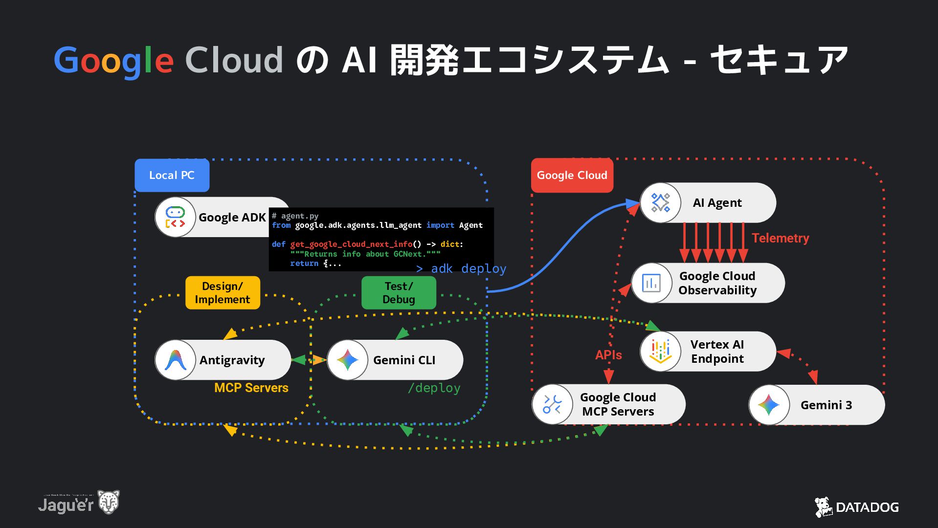 PC Google ADK # agent.py from google.adk.agents.llm_agent import Agent def get_google_cloud_next_info() -> dict: """Returns info about GCNext.""" return {... Design/ Implement > adk deploy /deploy MCP Servers Antigravity Gemini CLI Google Cloud Observability AI Agent  Google Cloud MCP Servers Telemetry APIs