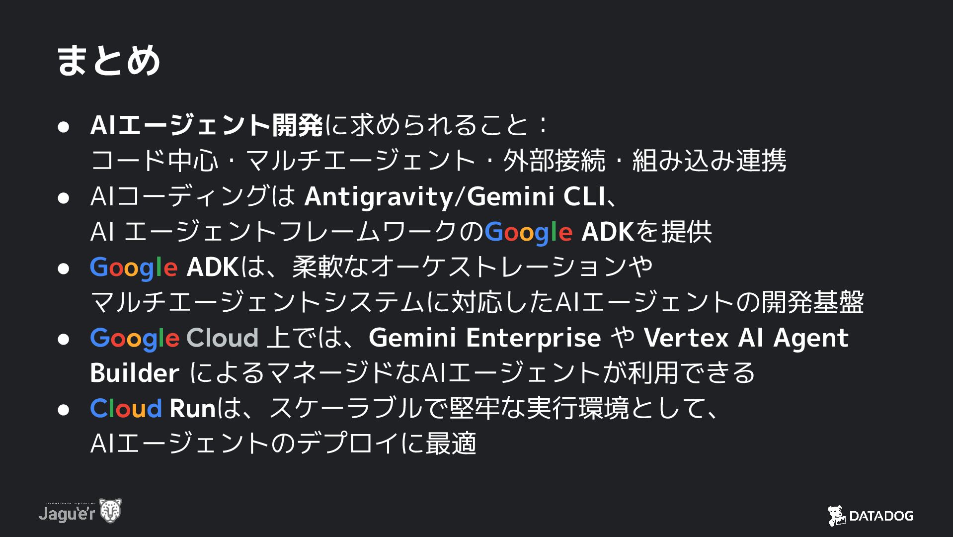ADKを提供 • Google ADKは、柔軟なオーケストレーションや マルチエージェントシステムに対応したAIエージェントの開発基盤 • Google Cloud 上では、Gemini Enterprise や Vertex AI Agent Builder によるマネージドなAIエージェントが利用できる • Cloud Runは、スケーラブルで堅牢な実行環境として、 AIエージェントのデプロイに最適