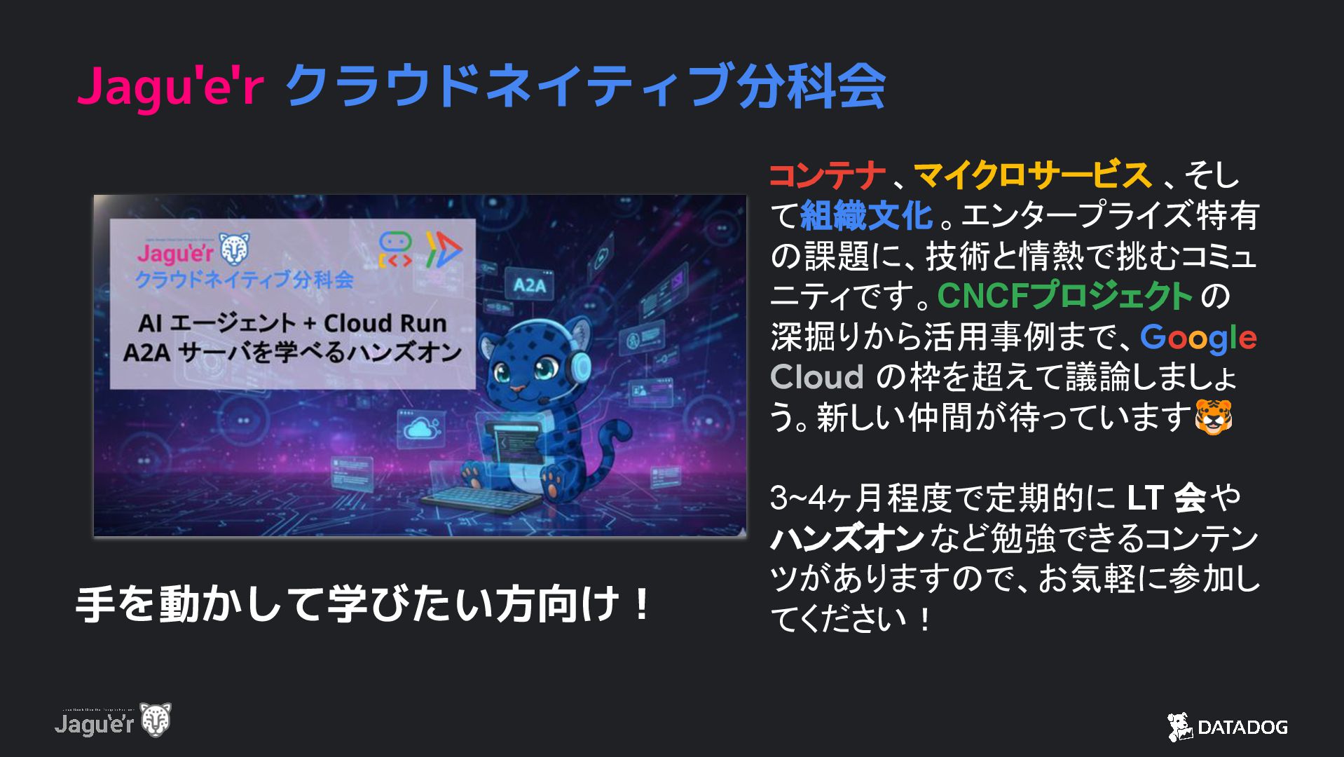 24. Jagu'e'r クラウドネイティブ分科会 コンテナ、マイクロサービス 、そし て組織文化。エンタープライズ特有 の課題に、技術と情熱で挑むコミュ ニティです。CNCFプロジェクト の 深掘りから活用事例まで、Google Cloud