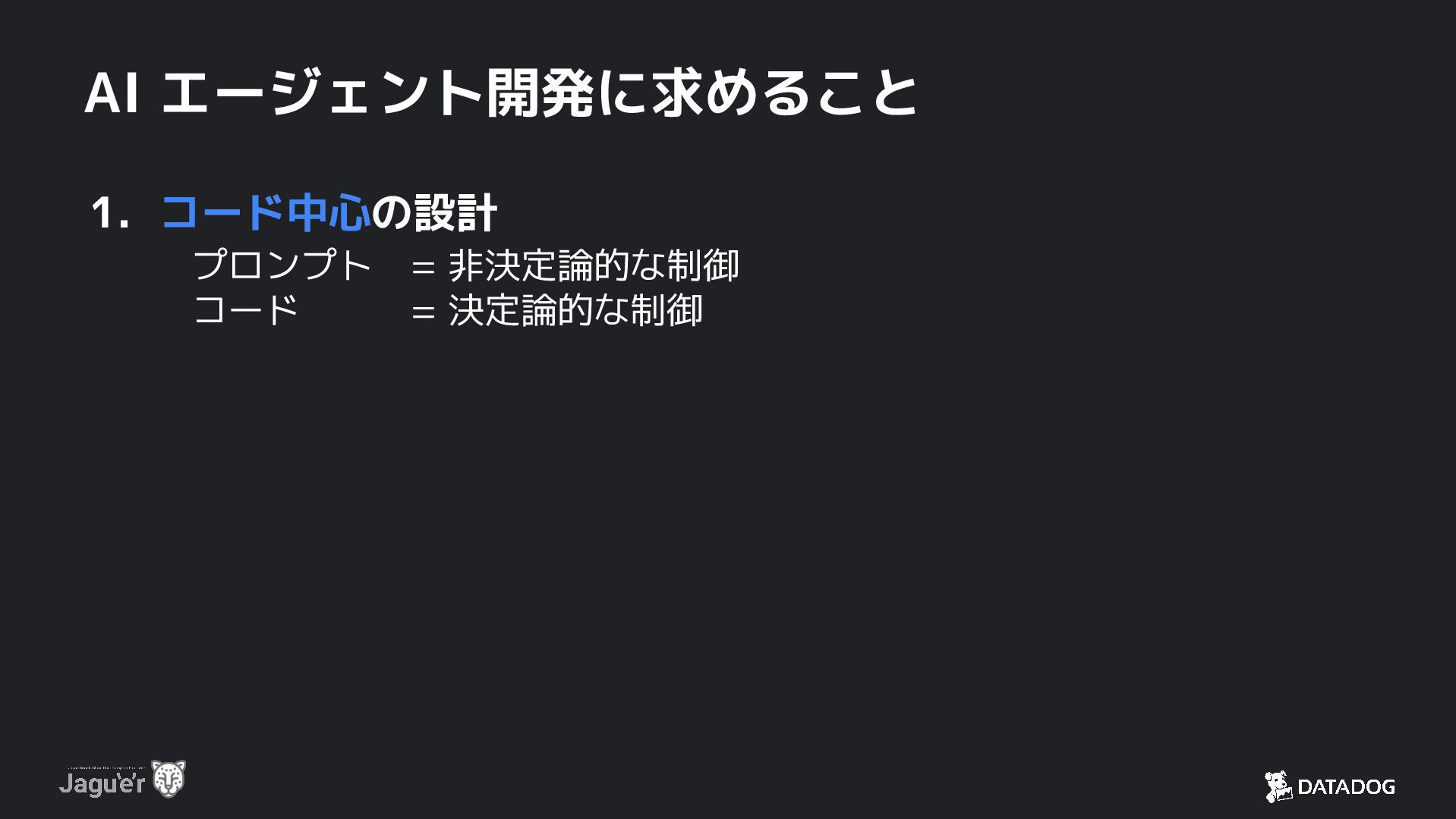 7. AI エージェント開発に求めること 1. コード中心の設計 プロンプト = 非決定論的な制御 コード = 決定論的な制御