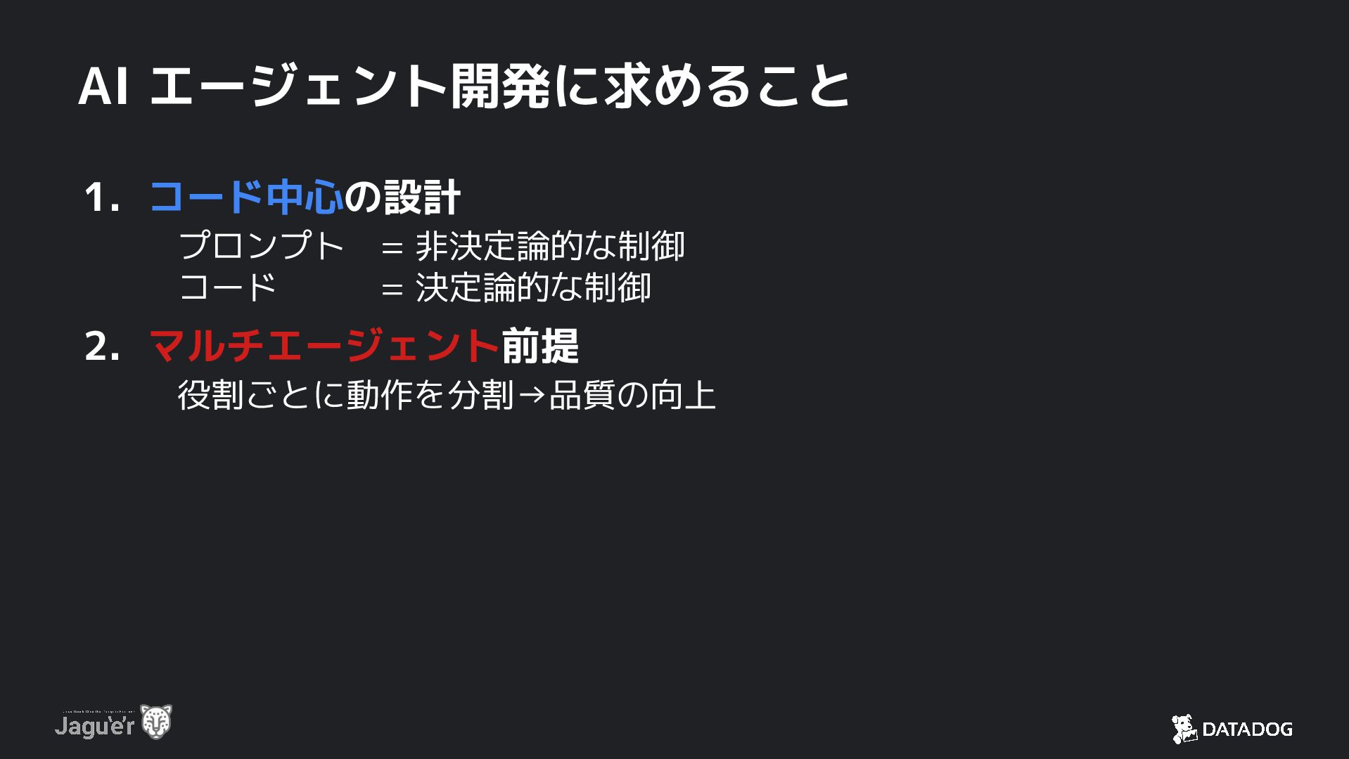 6. AI エージェント開発に求めること 1. コード中心の設計 プロンプト = 非決定論的な制御 コード = 決定論的な制御
