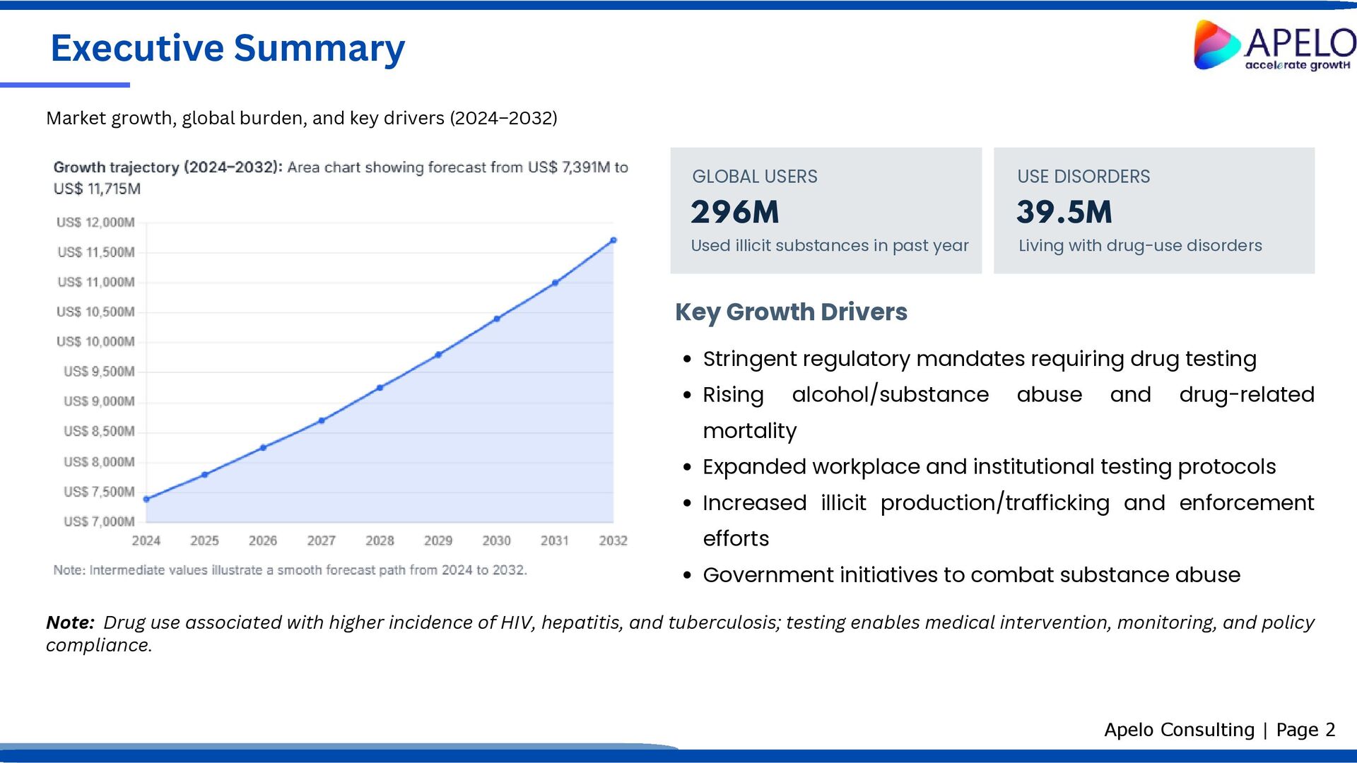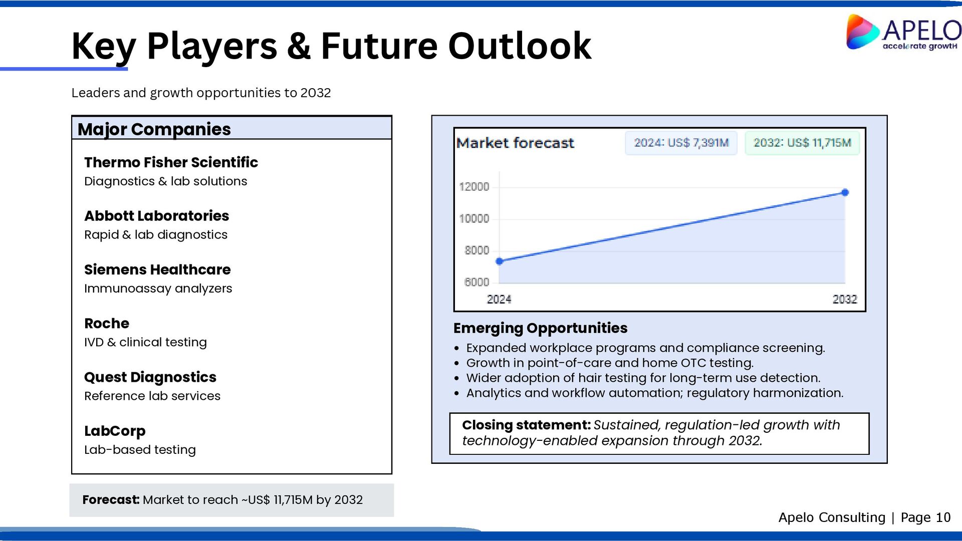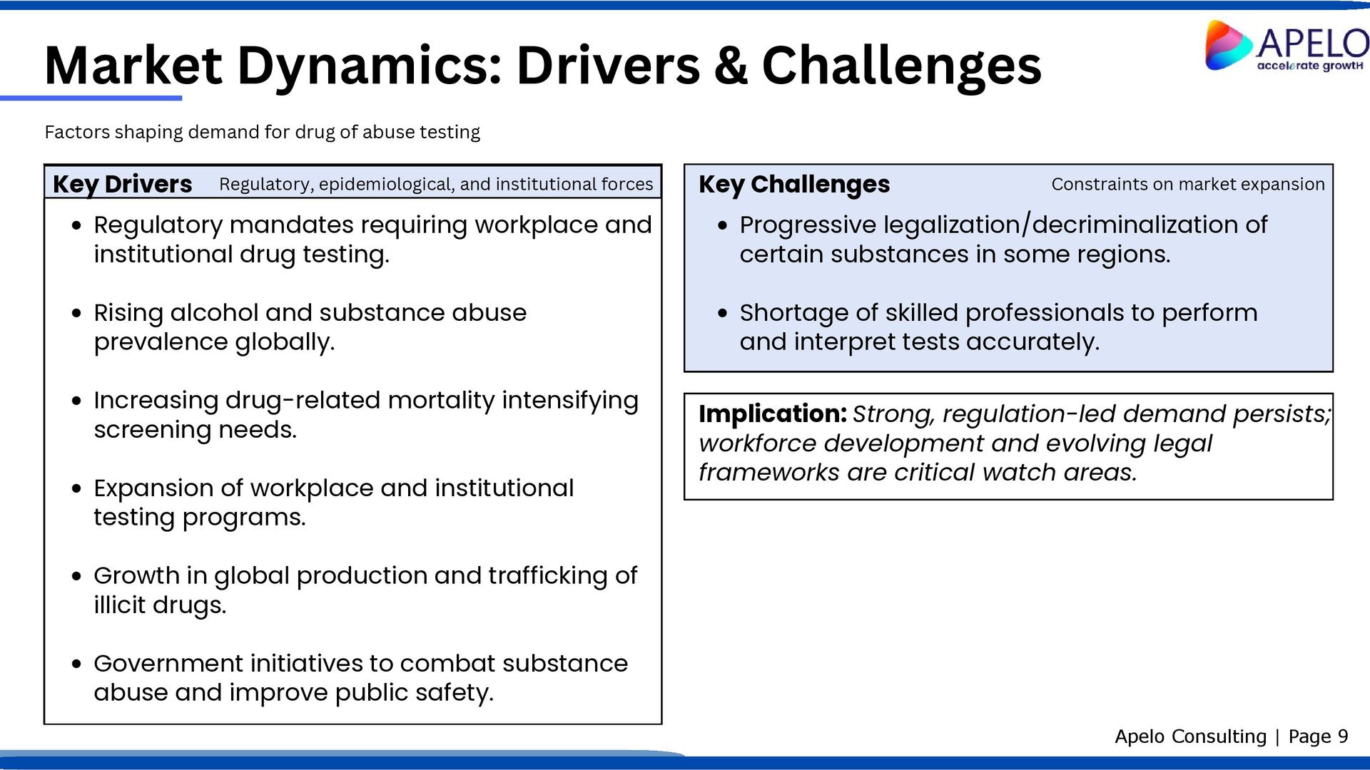 Regulatory mandates requiring workplace and institutional drug testing. Rising alcohol and substance abuse prevalence globally. Increasing drug-related mortality intensifying screening needs. Expansion of workplace and institutional testing programs. Growth in global production and trafficking of illicit drugs. Government initiatives to combat substance abuse and improve public safety. Factors shaping demand for drug of abuse testing Apelo Consulting | Page 9 Key Challenges Progressive legalization/decriminalization of certain substances in some regions. Shortage of skilled professionals to perform and interpret tests accurately. Implication: Strong, regulation-led demand persists; workforce development and evolving legal frameworks are critical watch areas. Key Drivers Regulatory, epidemiological, and institutional forces Constraints on market expansion