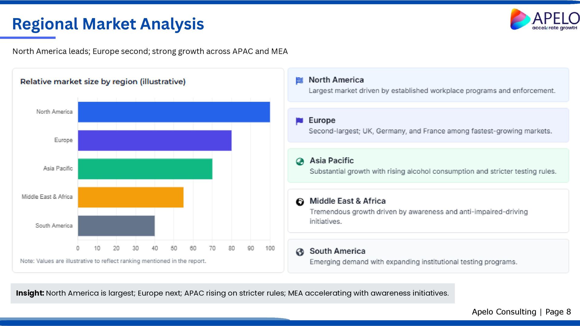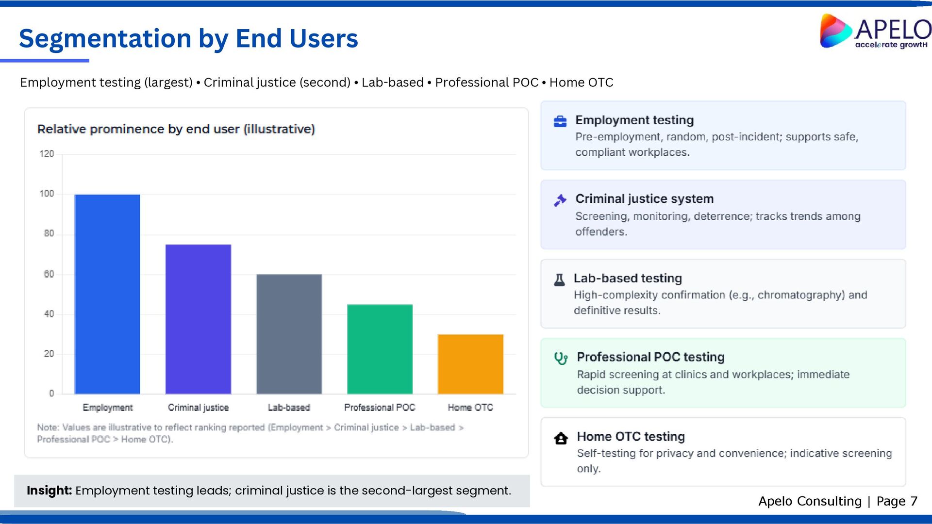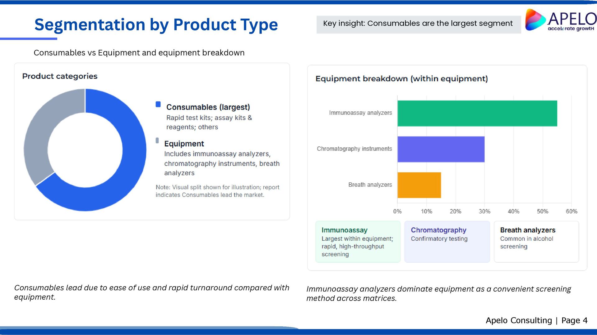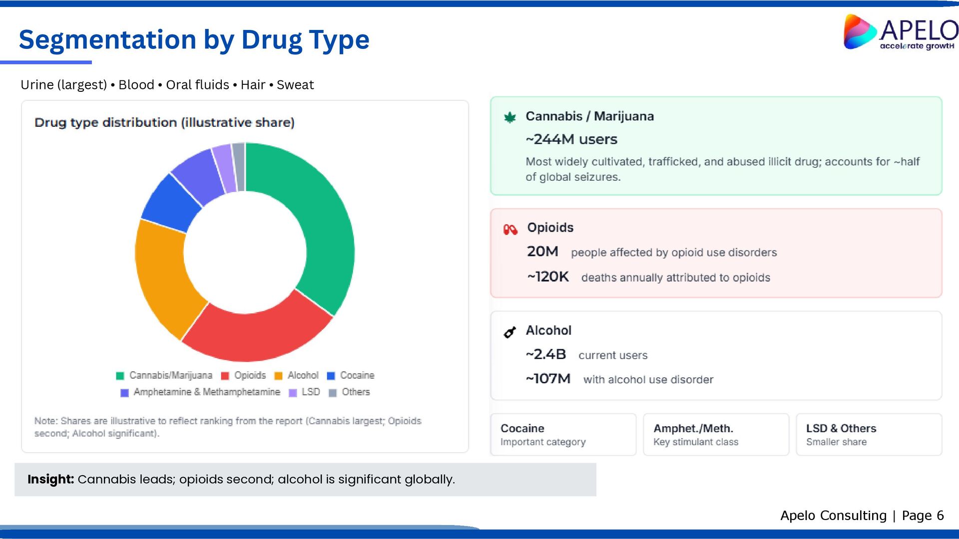 Regulatory mandates requiring workplace and institutional drug testing. Rising alcohol and substance abuse prevalence globally. Increasing drug-related mortality intensifying screening needs. Expansion of workplace and institutional testing programs. Growth in global production and trafficking of illicit drugs. Government initiatives to combat substance abuse and improve public safety. Factors shaping demand for drug of abuse testing Apelo Consulting | Page 9 Key Challenges Progressive legalization/decriminalization of certain substances in some regions. Shortage of skilled professionals to perform and interpret tests accurately. Implication: Strong, regulation-led demand persists; workforce development and evolving legal frameworks are critical watch areas. Key Drivers Regulatory, epidemiological, and institutional forces Constraints on market expansion