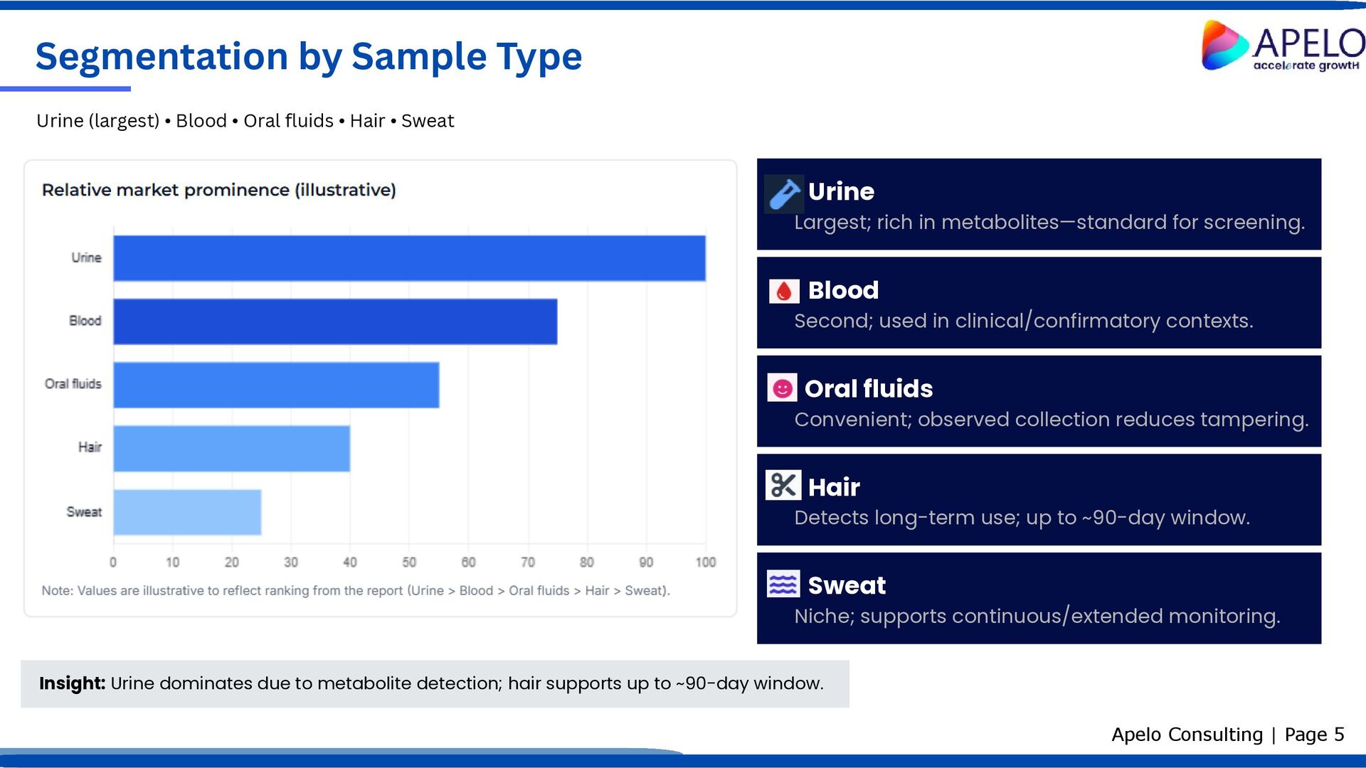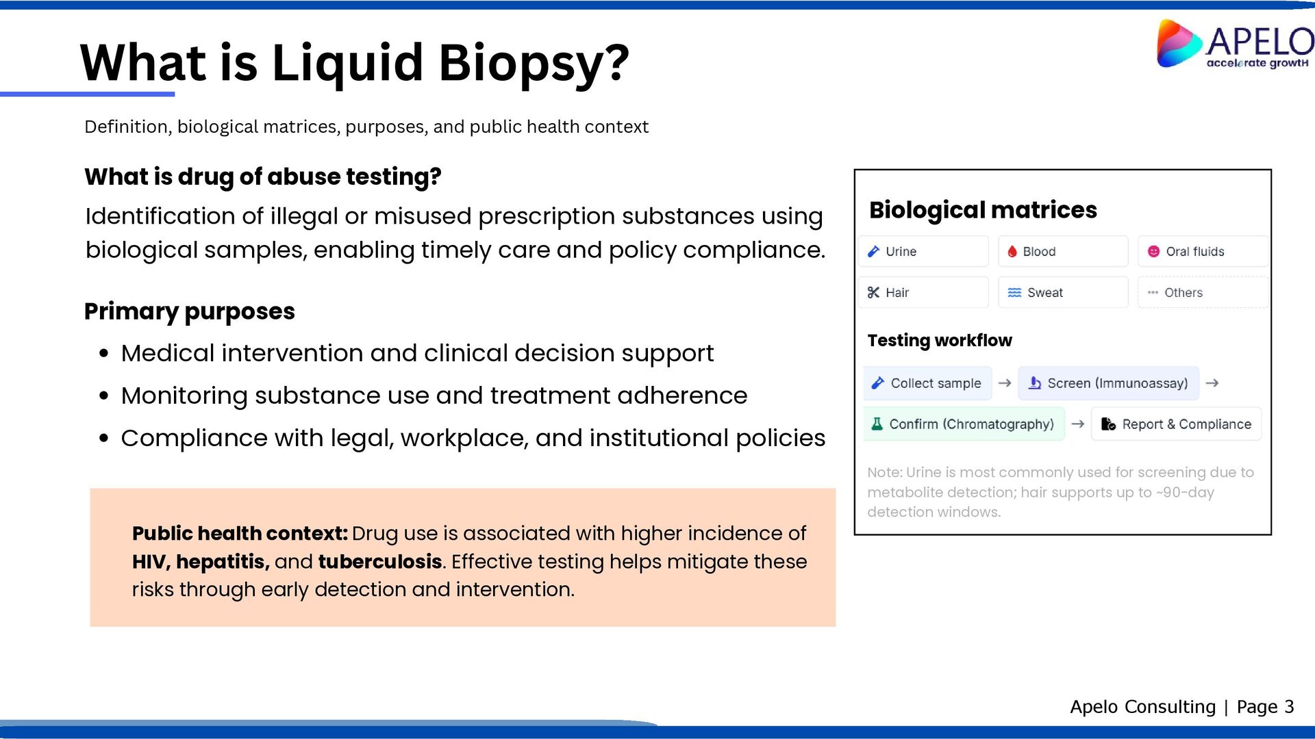 is drug of abuse testing? Primary purposes Biological matrices Medical intervention and clinical decision support Monitoring substance use and treatment adherence Compliance with legal, workplace, and institutional policies Public health context: Drug use is associated with higher incidence of HIV, hepatitis, and tuberculosis. Effective testing helps mitigate these risks through early detection and intervention. Testing workflow Note: Urine is most commonly used for screening due to metabolite detection; hair supports up to ~90-day detection windows. Identification of illegal or misused prescription substances using biological samples, enabling timely care and policy compliance. Definition, biological matrices, purposes, and public health context Apelo Consulting | Page 3