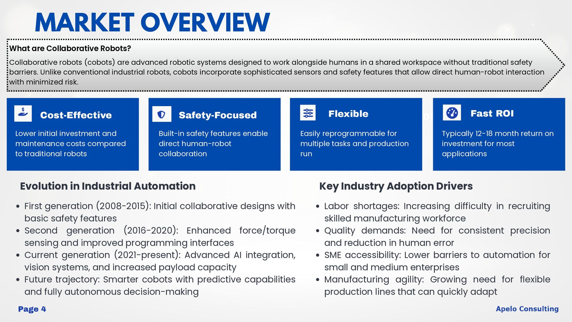 Apelo Consulting has released a report on Global Collaborative Robots Market, Segment Analysis, Company Share Insights, Market Dynamics and Recent Developments – Forecast to 2030.
