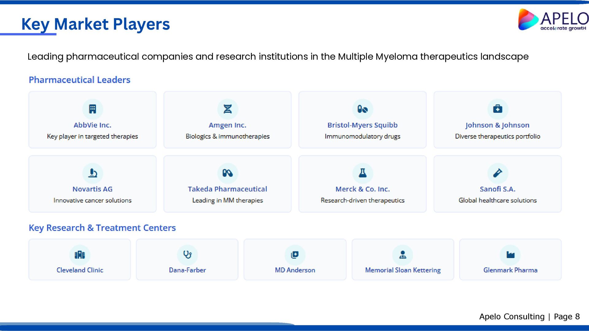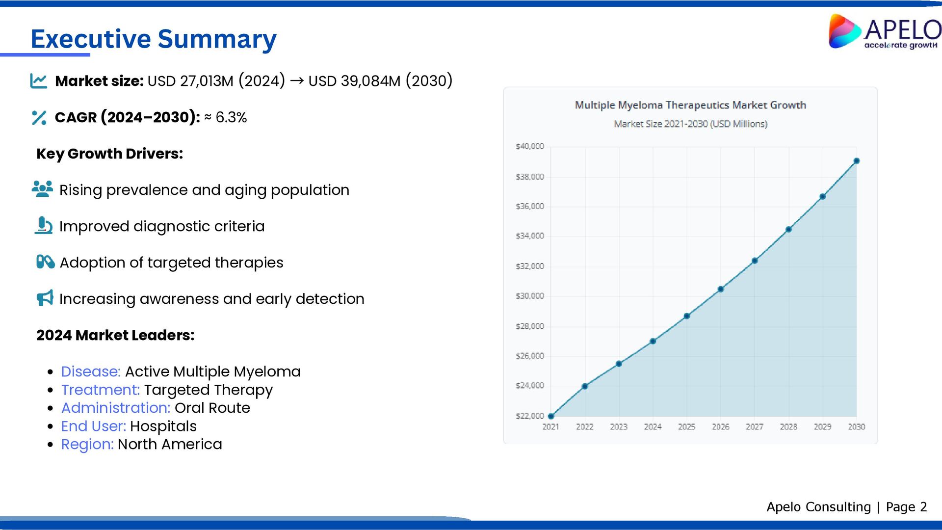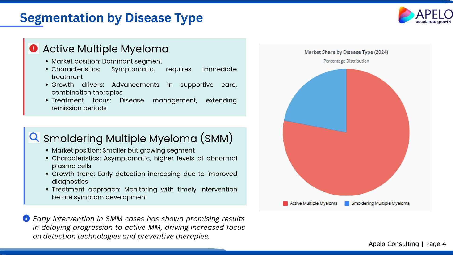 cells, leading to organ dysfunction and eventually death Treatment Landscape: Chemotherapy: Targets rapidly dividing cancer cells throughout the body Targeted Therapy: Proteasome inhibitors and monoclonal antibodies - less toxic alternatives Immunomodulating Agents: Thalidomide, lenalidomide, pomalidomide Radiation Therapy: Manages localized bone lesions, alleviates pain Stem Cell Transplantation: For eligible patients, after induction Apelo Consulting | Page 3 Market Overview & Disease Profile Market Focus: Early diagnosis and tailored treatments are crucial for enhancing patient outcomes and increasing survival rates 36,110 New cases expected in the U.S. (2025) Source: National Cancer Institute