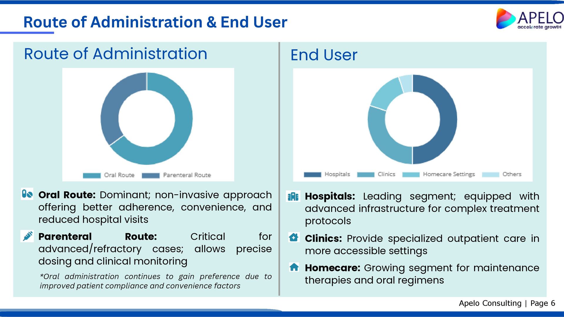 Administration & End User *Oral administration continues to gain preference due to improved patient compliance and convenience factors Oral Route: Dominant; non-invasive approach offering better adherence, convenience, and reduced hospital visits Parenteral Route: Critical for advanced/refractory cases; allows precise dosing and clinical monitoring Hospitals: Leading segment; equipped with advanced infrastructure for complex treatment protocols Clinics: Provide specialized outpatient care in more accessible settings Homecare: Growing segment for maintenance therapies and oral regimens End User