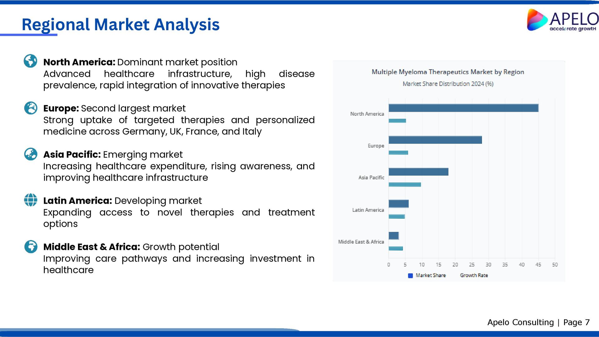 prevalence, rapid integration of innovative therapies Europe: Second largest market Strong uptake of targeted therapies and personalized medicine across Germany, UK, France, and Italy Asia Pacific: Emerging market Increasing healthcare expenditure, rising awareness, and improving healthcare infrastructure Latin America: Developing market Expanding access to novel therapies and treatment options Middle East & Africa: Growth potential Improving care pathways and increasing investment in healthcare Apelo Consulting | Page 7 Regional Market Analysis