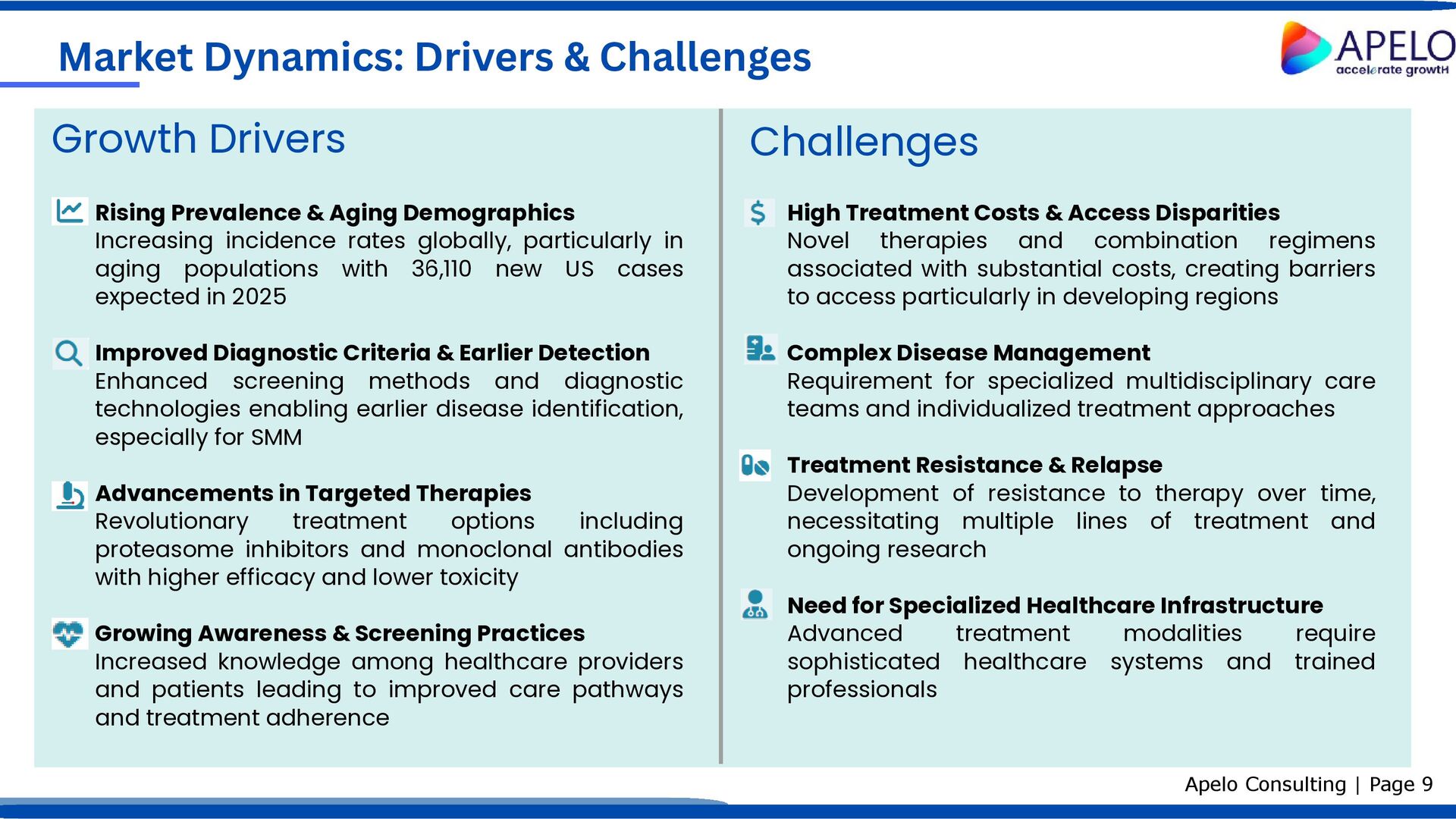 & Challenges Rising Prevalence & Aging Demographics Increasing incidence rates globally, particularly in aging populations with 36,110 new US cases expected in 2025 Improved Diagnostic Criteria & Earlier Detection Enhanced screening methods and diagnostic technologies enabling earlier disease identification, especially for SMM Advancements in Targeted Therapies Revolutionary treatment options including proteasome inhibitors and monoclonal antibodies with higher efficacy and lower toxicity Growing Awareness & Screening Practices Increased knowledge among healthcare providers and patients leading to improved care pathways and treatment adherence Challenges High Treatment Costs & Access Disparities Novel therapies and combination regimens associated with substantial costs, creating barriers to access particularly in developing regions Complex Disease Management Requirement for specialized multidisciplinary care teams and individualized treatment approaches Treatment Resistance & Relapse Development of resistance to therapy over time, necessitating multiple lines of treatment and ongoing research Need for Specialized Healthcare Infrastructure Advanced treatment modalities require sophisticated healthcare systems and trained professionals