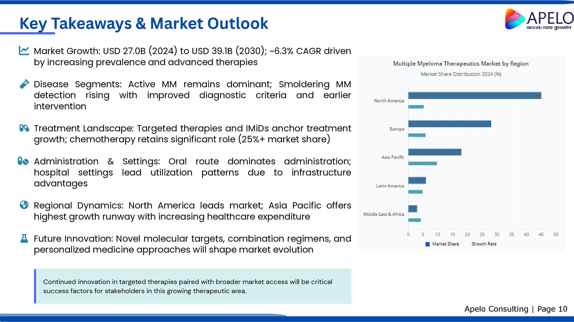 CAGR driven by increasing prevalence and advanced therapies Disease Segments: Active MM remains dominant; Smoldering MM detection rising with improved diagnostic criteria and earlier intervention Treatment Landscape: Targeted therapies and IMiDs anchor treatment growth; chemotherapy retains significant role (25%+ market share) Administration & Settings: Oral route dominates administration; hospital settings lead utilization patterns due to infrastructure advantages Regional Dynamics: North America leads market; Asia Pacific offers highest growth runway with increasing healthcare expenditure Future Innovation: Novel molecular targets, combination regimens, and personalized medicine approaches will shape market evolution Apelo Consulting | Page 10 Key Takeaways & Market Outlook Continued innovation in targeted therapies paired with broader market access will be critical success factors for stakeholders in this growing therapeutic area.