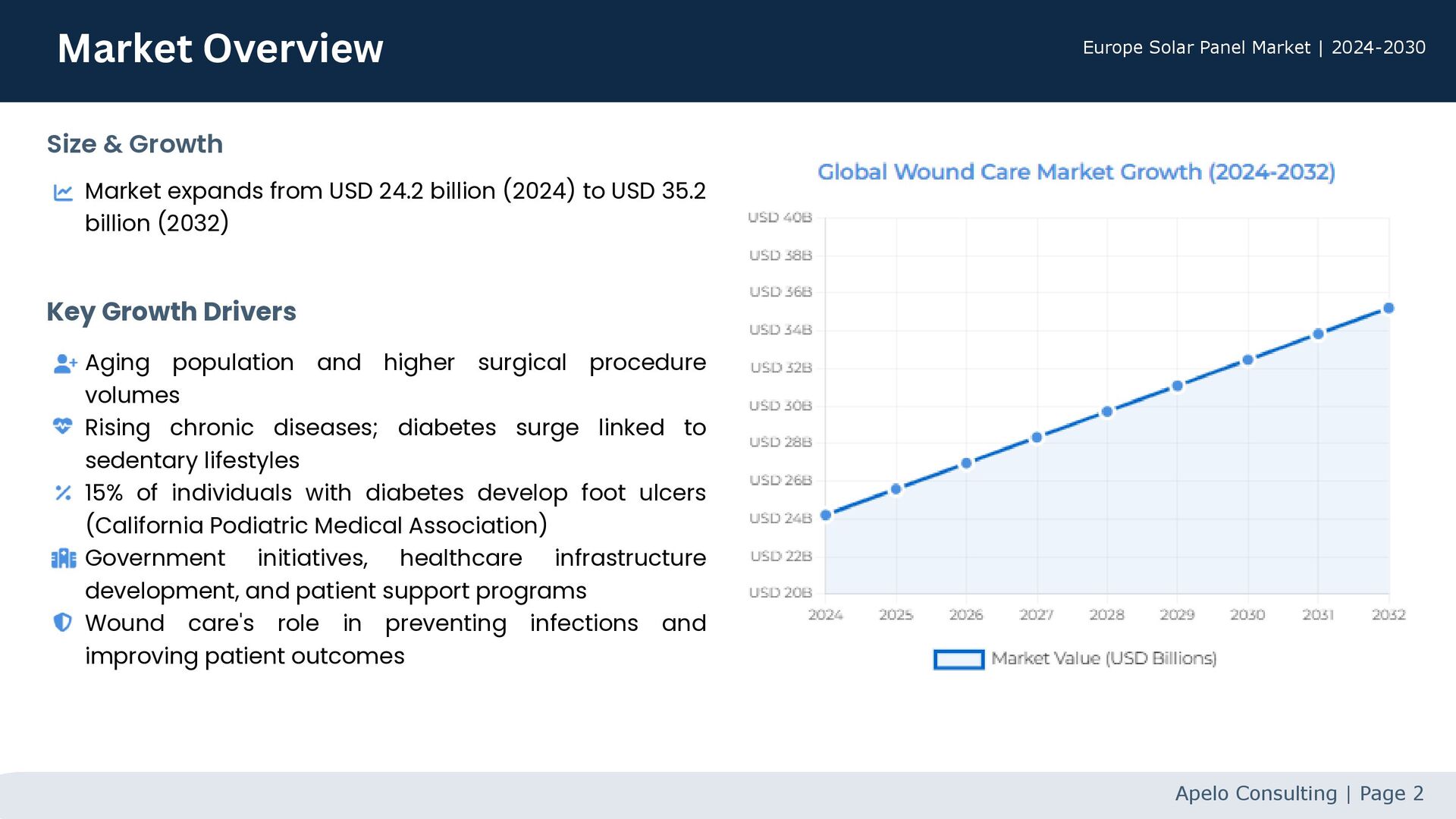 billion (2032) Aging population and higher surgical procedure volumes Rising chronic diseases; diabetes surge linked to sedentary lifestyles 15% of individuals with diabetes develop foot ulcers (California Podiatric Medical Association) Government initiatives, healthcare infrastructure development, and patient support programs Wound care's role in preventing infections and improving patient outcomes Apelo Consulting | Page 2 Market Overview Europe Solar Panel Market | 2024-2030 Size & Growth Key Growth Drivers