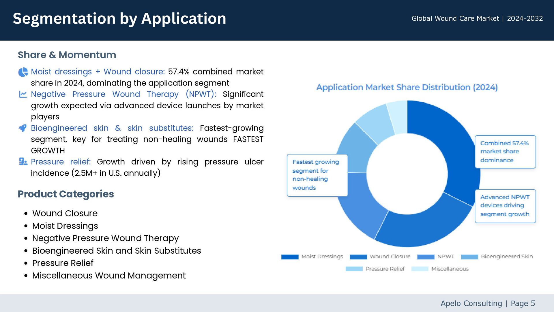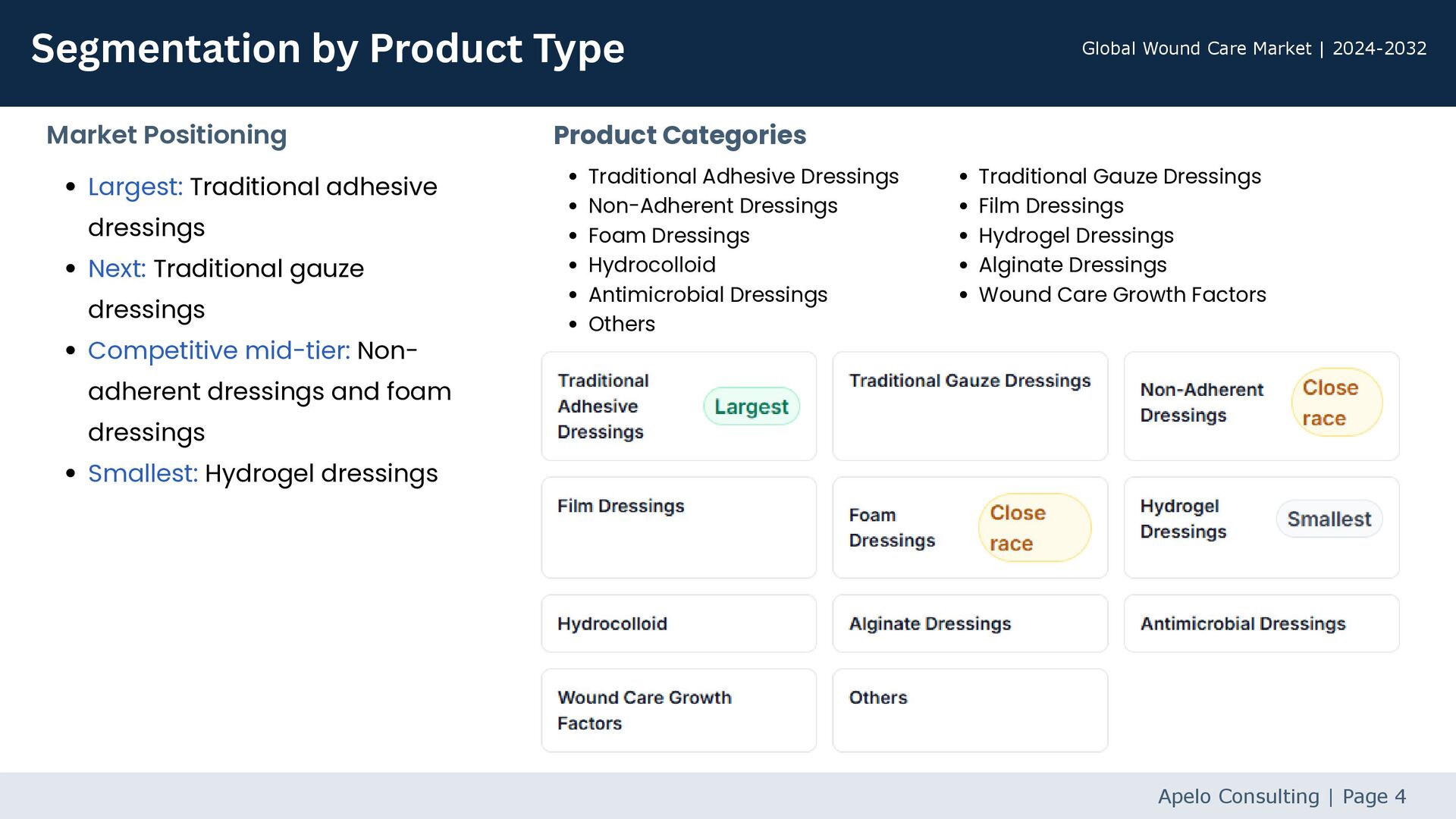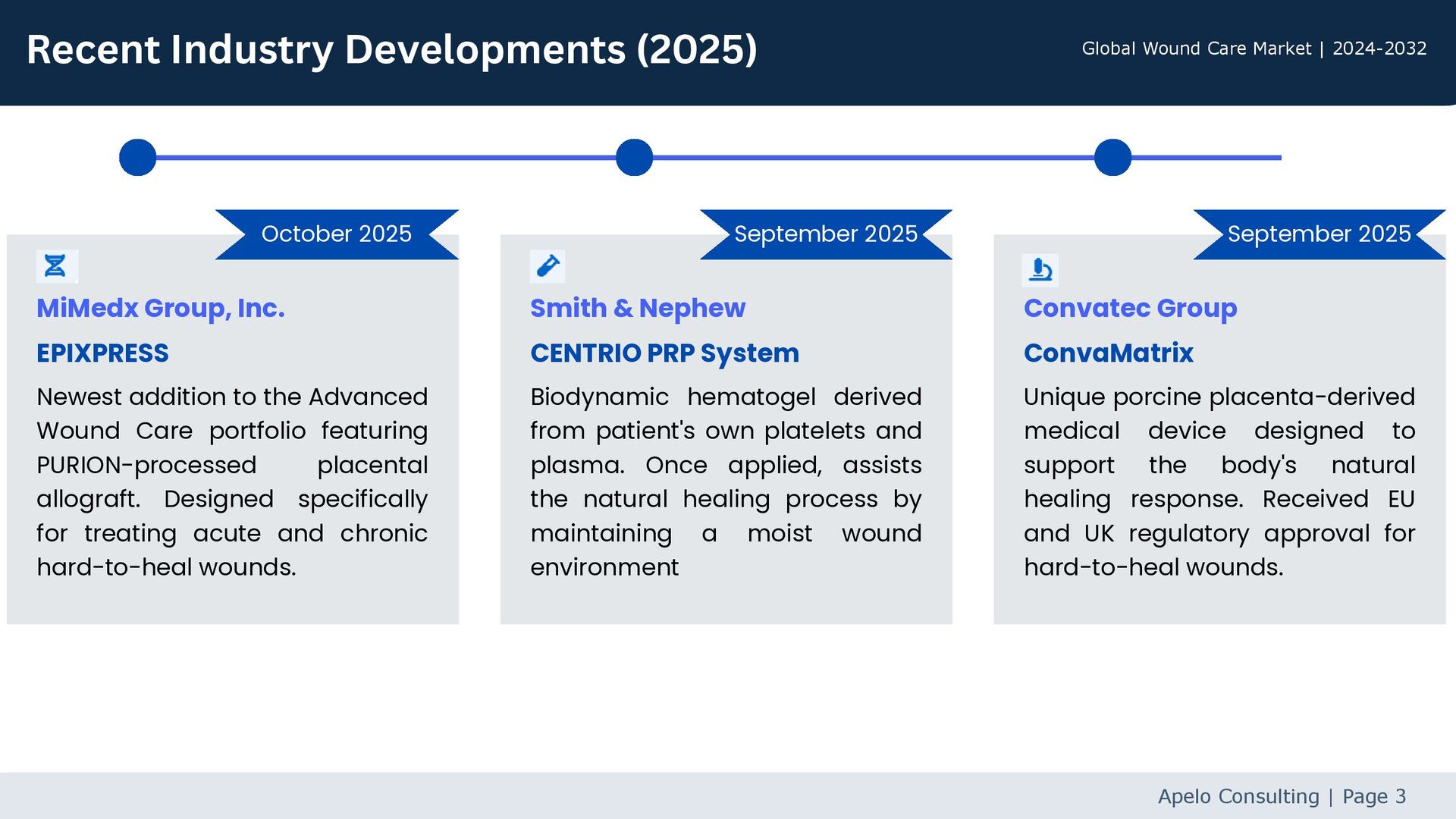 Global Wound Care Market | 2024-2032 MiMedx Group, Inc. Newest addition to the Advanced Wound Care portfolio featuring PURION-processed placental allograft. Designed specifically for treating acute and chronic hard-to-heal wounds. Apelo Consulting | Page 3 EPIXPRESS Smith & Nephew Biodynamic hematogel derived from patient's own platelets and plasma. Once applied, assists the natural healing process by maintaining a moist wound environment CENTRIO PRP System Convatec Group Unique porcine placenta-derived medical device designed to support the body's natural healing response. Received EU and UK regulatory approval for hard-to-heal wounds. ConvaMatrix