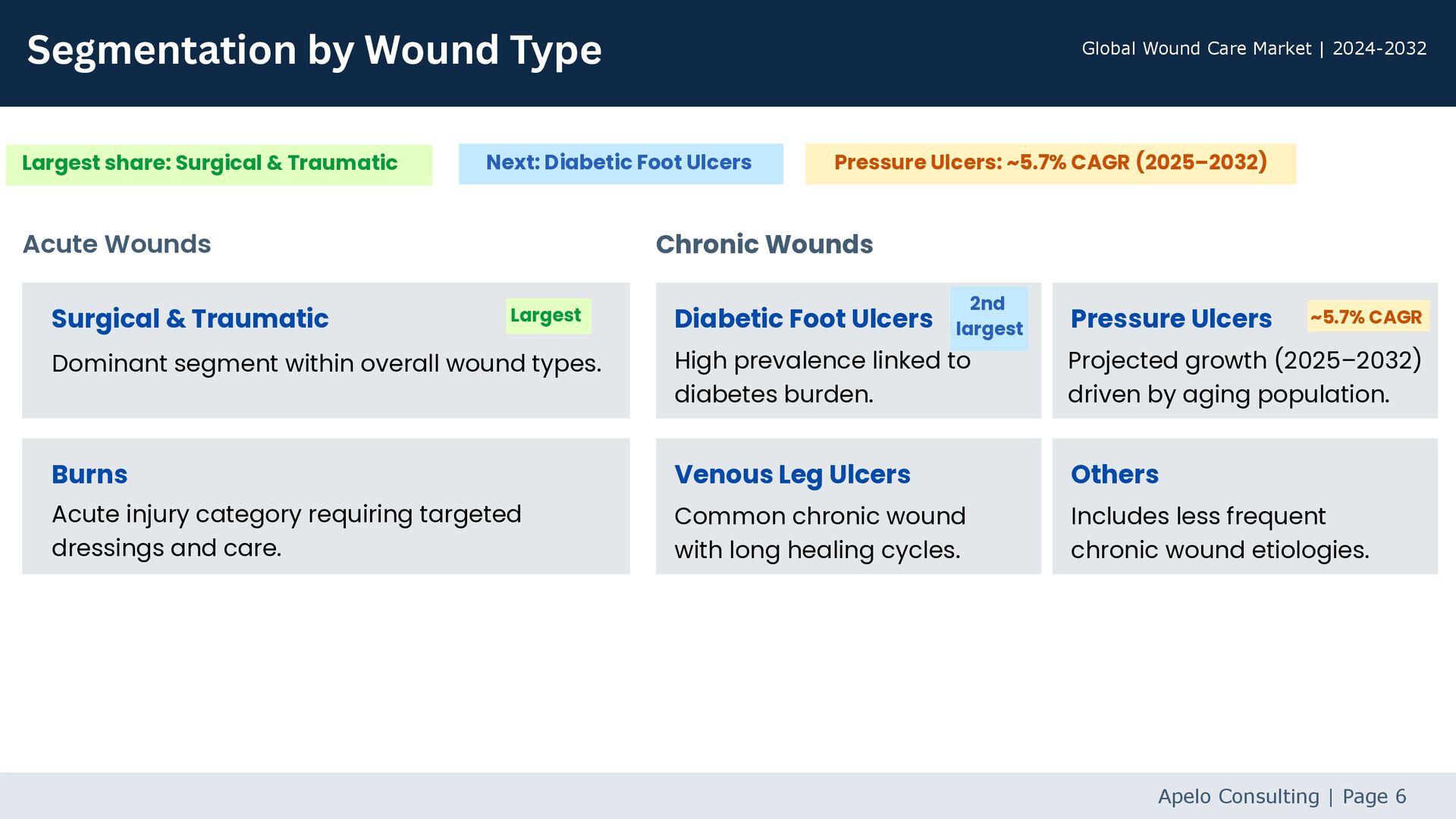 Apelo Consulting has released a report on “Global Wound Care Market (by Product Type, Application, Wound Type, Country and Company Analysis), Size, Share, Acquisitions, Recent Developments - Forecast to 2032”