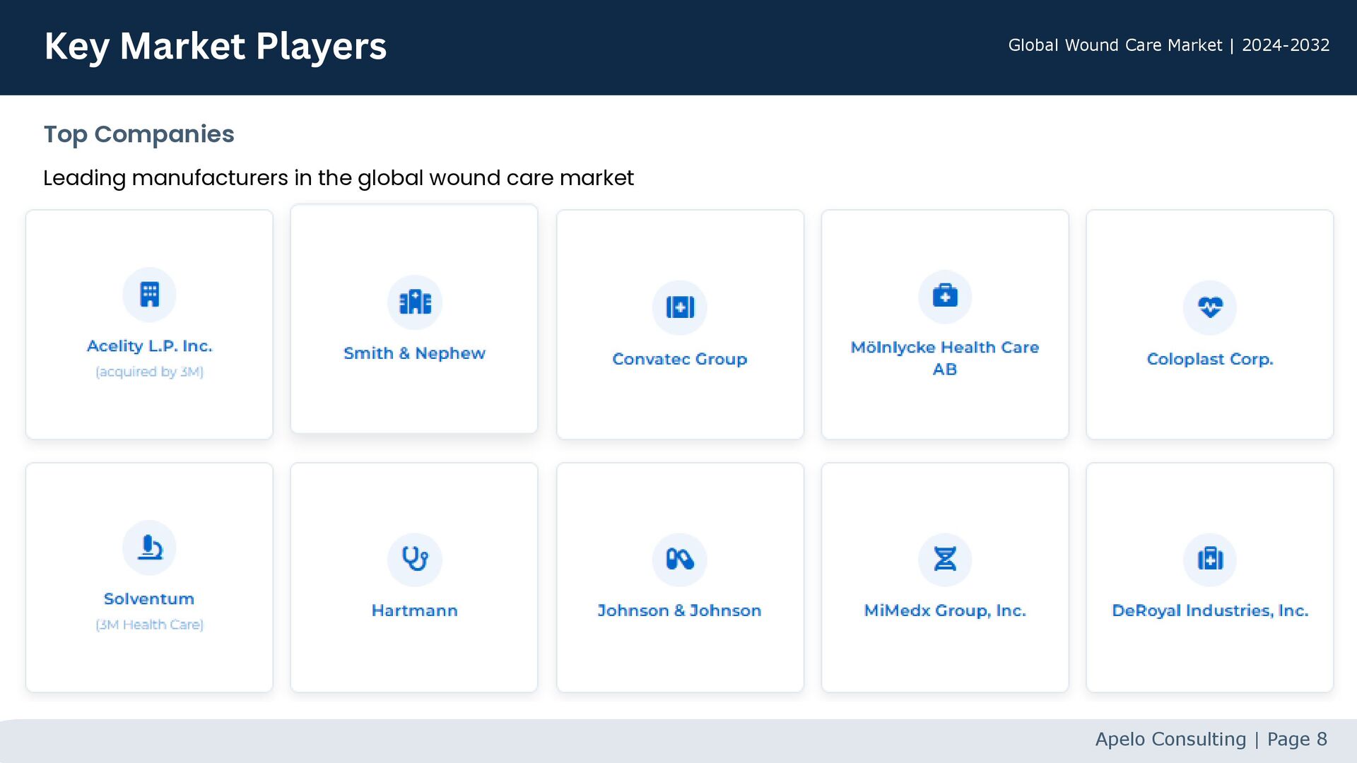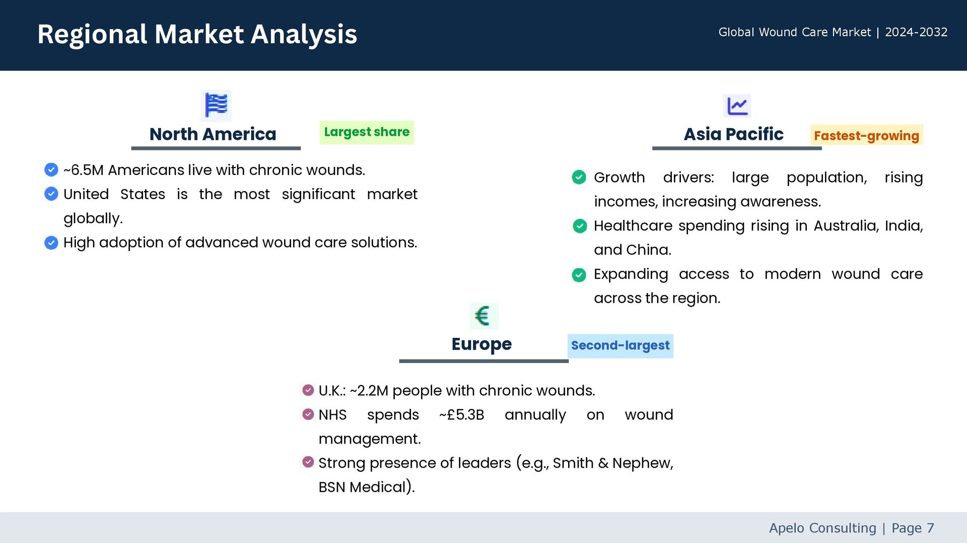 most significant market globally. High adoption of advanced wound care solutions. Growth drivers: large population, rising incomes, increasing awareness. Healthcare spending rising in Australia, India, and China. Expanding access to modern wound care across the region. U.K.: ~2.2M people with chronic wounds. NHS spends ~£5.3B annually on wound management. Strong presence of leaders (e.g., Smith & Nephew, BSN Medical). Regional Market Analysis Apelo Consulting | Page 7 North America Asia Pacific Europe Largest share Second-largest Fastest-growing Global Wound Care Market | 2024-2032
