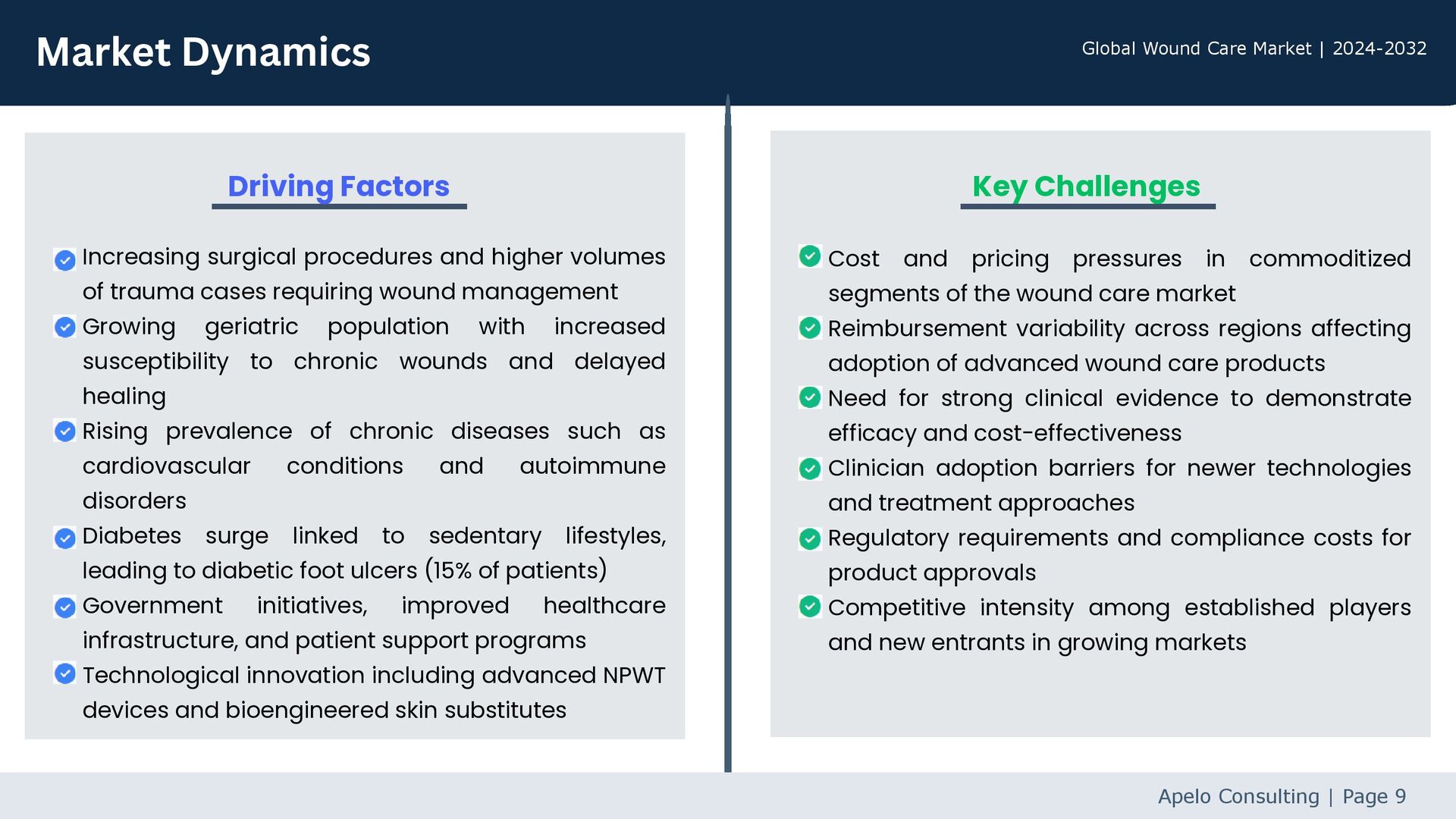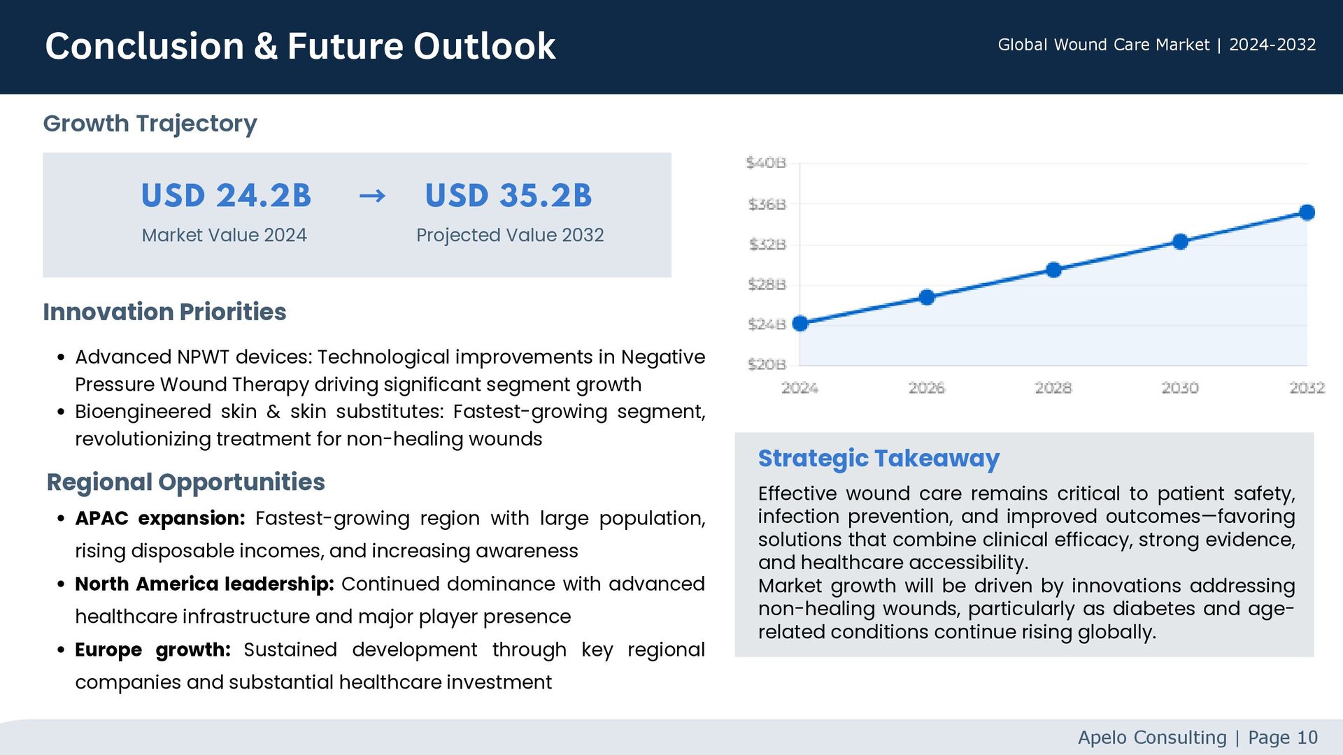 wound management Growing geriatric population with increased susceptibility to chronic wounds and delayed healing Rising prevalence of chronic diseases such as cardiovascular conditions and autoimmune disorders Diabetes surge linked to sedentary lifestyles, leading to diabetic foot ulcers (15% of patients) Government initiatives, improved healthcare infrastructure, and patient support programs Technological innovation including advanced NPWT devices and bioengineered skin substitutes Cost and pricing pressures in commoditized segments of the wound care market Reimbursement variability across regions affecting adoption of advanced wound care products Need for strong clinical evidence to demonstrate efficacy and cost-effectiveness Clinician adoption barriers for newer technologies and treatment approaches Regulatory requirements and compliance costs for product approvals Competitive intensity among established players and new entrants in growing markets Market Dynamics Apelo Consulting | Page 9 Driving Factors Key Challenges Global Wound Care Market | 2024-2032
