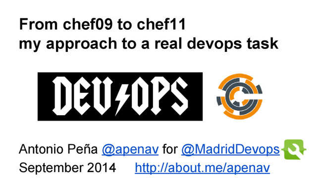 for tests nor TDD (to learn about) • Not enough RAM in laptop nor in AWS micro instances for making testing/CI with Vagrant • Foodcritic and more, but later • I hope to use them ASAP: just because I like it. The same with Puppet.